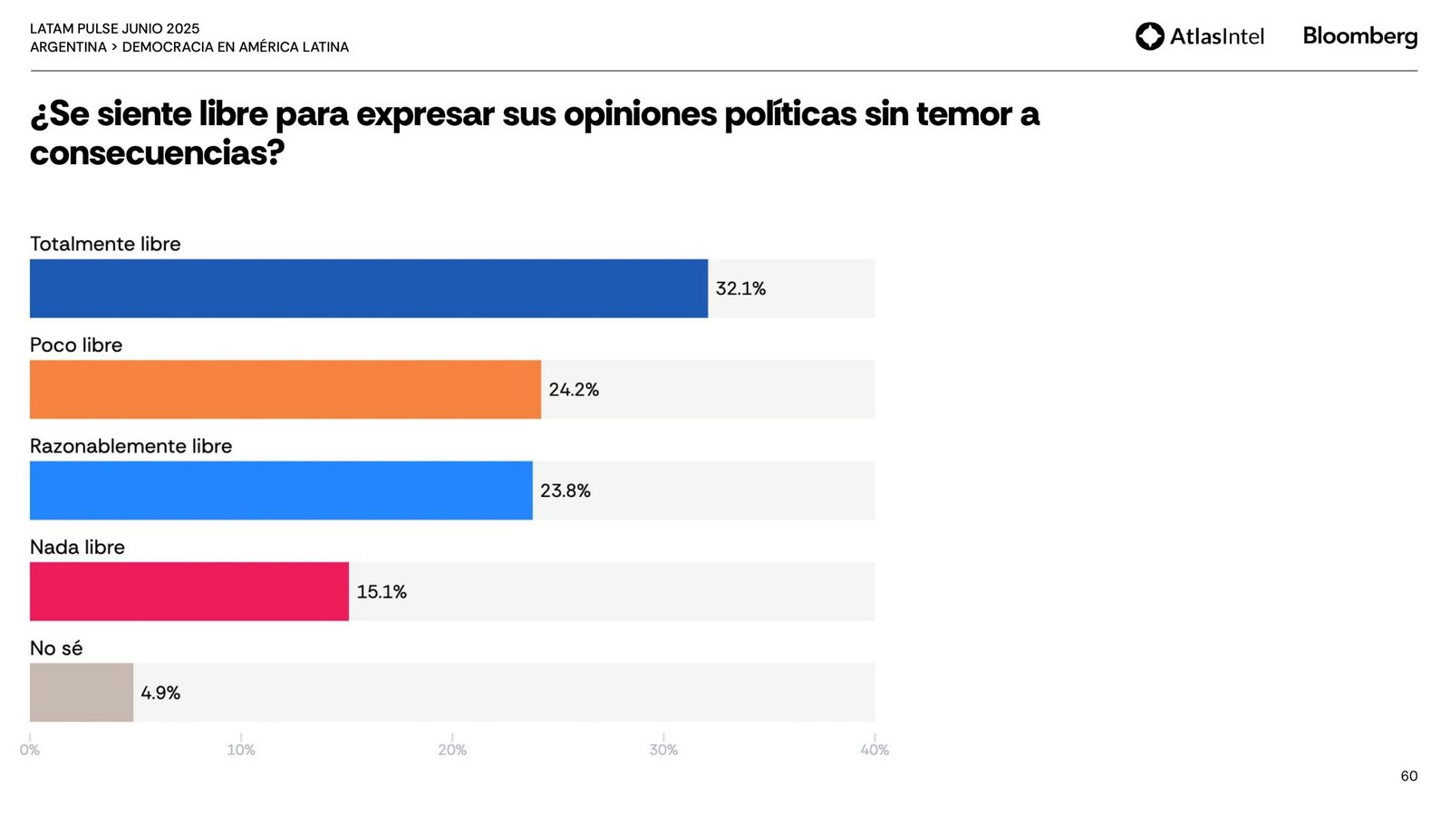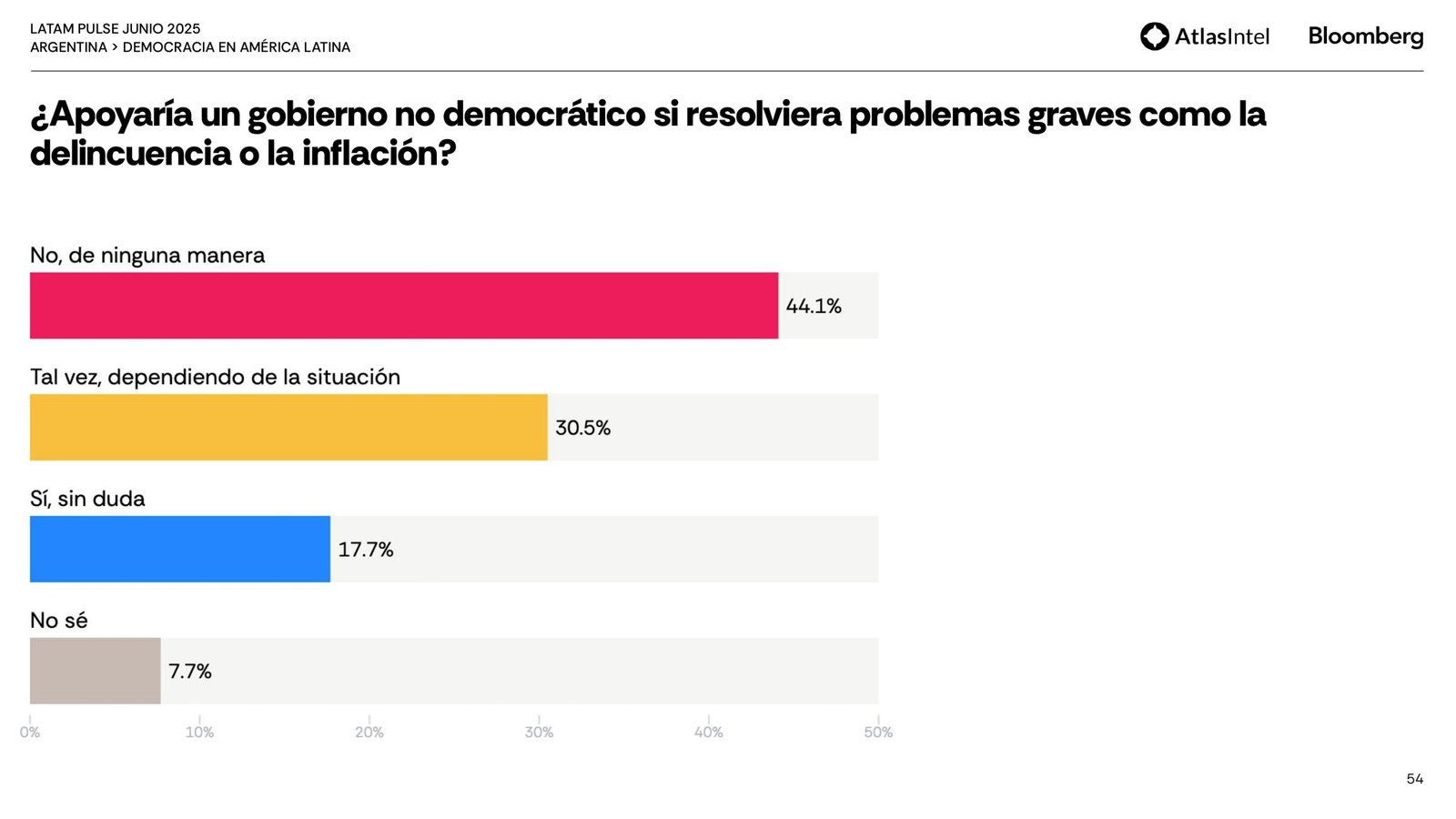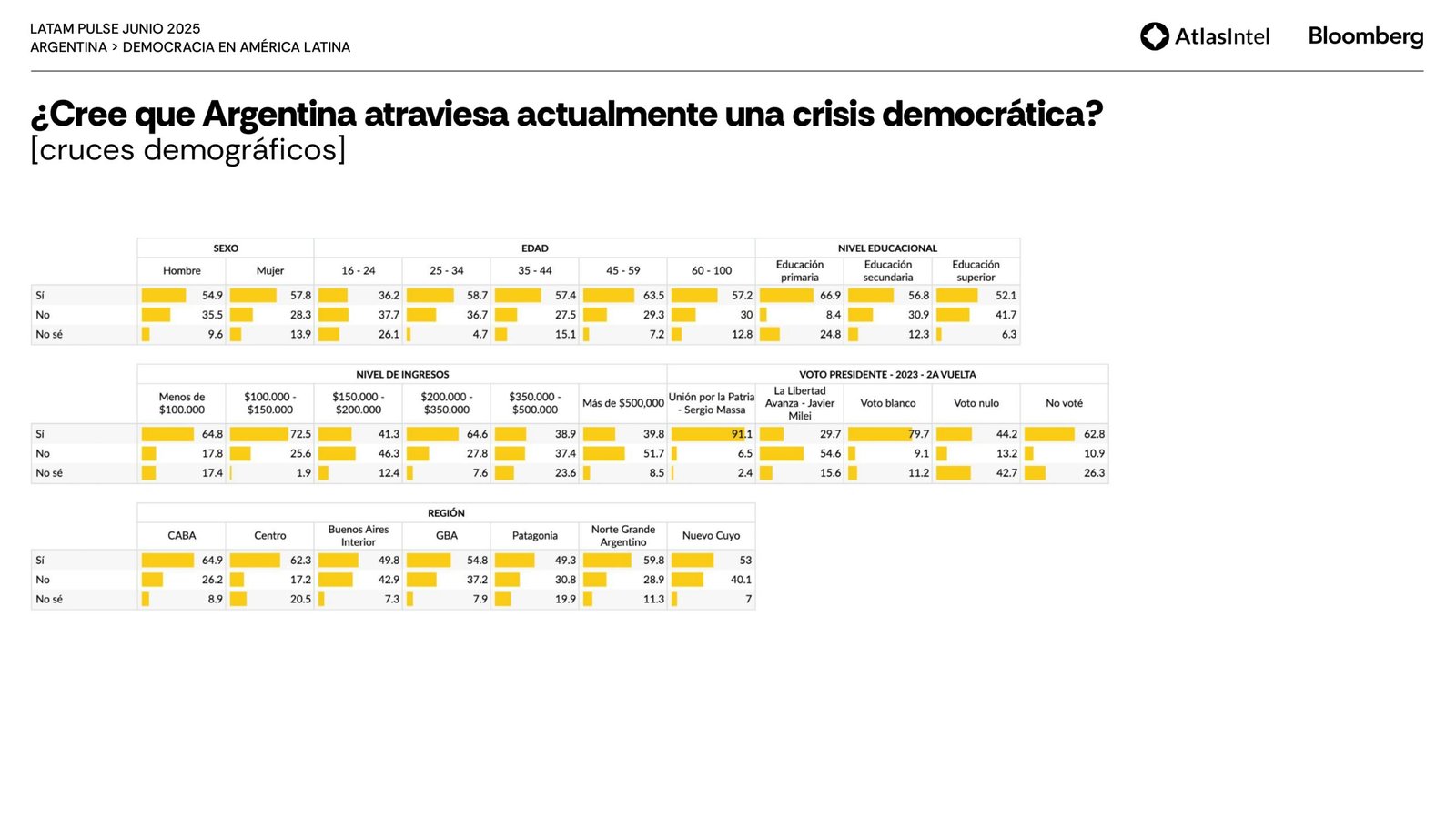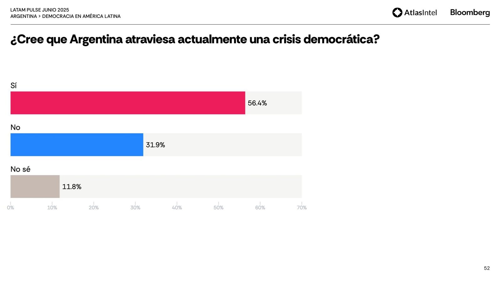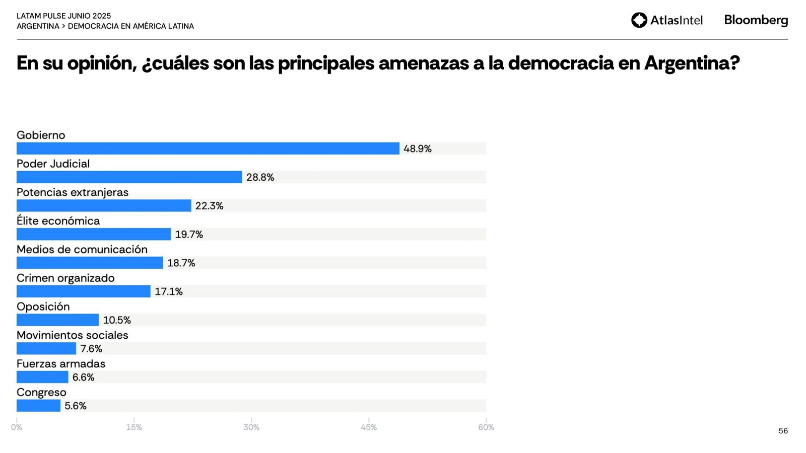 El dato más fuerte de este relevamiento es que el 56,4 por ciento de los encuestados cree que Argentina atraviesa actualmente una crisis democrática y para el 48,9, el gobierno es percibido como la principal amenaza a la democracia.