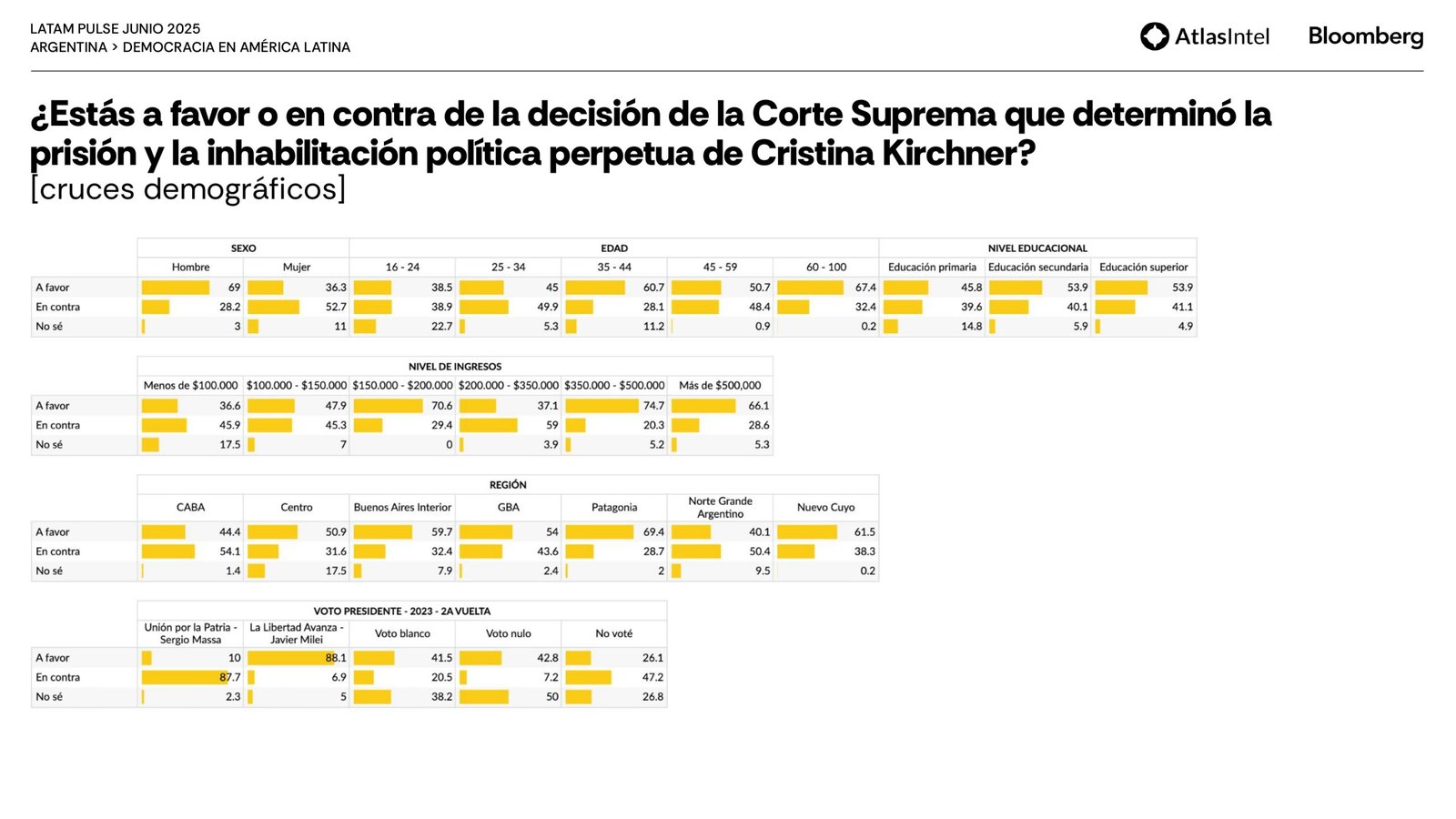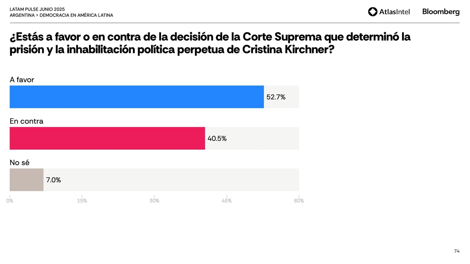 No obstante, un 52,7% de la población está a favor de su prisión e inhabilitación política contra un 40,5% se posiciona contra la decisión judicial que la condenó.