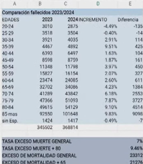 Sylvestre puso el foco en el dato que quema. Más muertes en mayores de 65. Atienza fue tajante: “No tenga duda que están ahí las causas”. Y comparó con la pandemia. En ese período, la tasa de exceso de muerte fue del 10,6 por ciento. Apenas por encima. “Hoy día están muriendo más personas que en plena pandemia en ese grupo etario. Algo está pasando”.