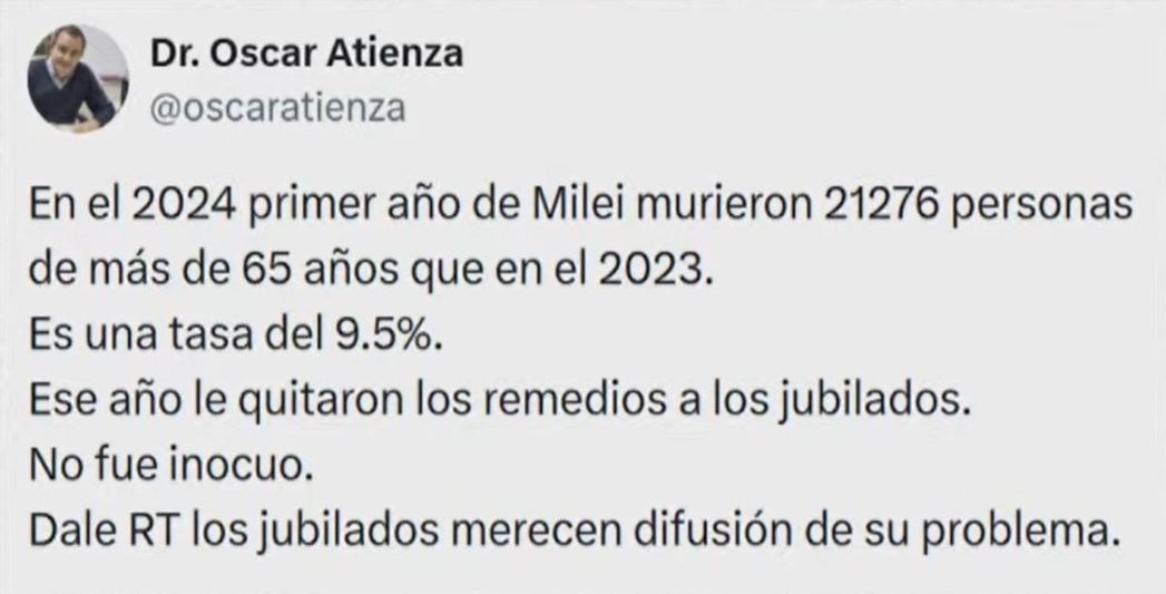 En una noche donde los números pesaron más que cualquier discurso libertario, Gustavo Sylvestre hizo lo que el Gobierno evita: leer los datos. En Minuto Uno, puso al aire un tuit del sanitarista cordobés Oscar Atienza y la cifra no dejó margen para eufemismos: en 2024, primer año de Javier Milei en la Casa Rosada, murieron 21.276 personas más mayores de 65 años que en 2023. Exceso de mortalidad del 9,5%. El mismo año en que se les quitaron los remedios a los jubilados. “No fue inocuo”, subrayó Sylvestre. “Dale RT, los jubilados merecen difusión de su problema”.