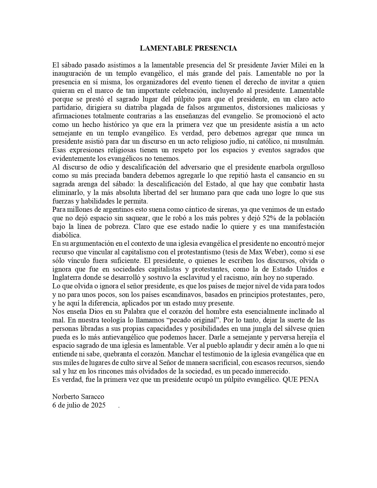 «Lo que olvida o ignora el señor presidente, es que los países de mejor nivel de vida para todos y no para unos pocos, son los países escandinavos, basados en principios protestantes, pero, y he aquí la diferencia, aplicados por un estado muy presente», agregó Saraco.