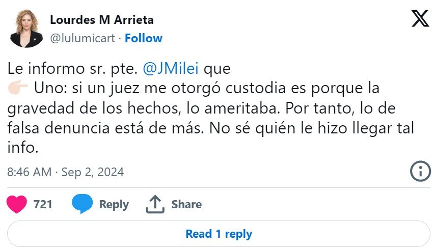 La mendocina que creo el monobloque FE salió a responder a Milei por redes sociales. «Si un juez me otorgó custodia es porque la gravedad de los hechos lo ameritaba. Por tanto, lo de falsa denuncia está de más. No sé quién le hizo llegar tal info», le dijo Arrieta. La custodia referida por la legisladora fue ordenada por Kreplak, luego de que Arrieta dijera que temía por su vida, tras revelar los entretelones de la visita a los genocidas.