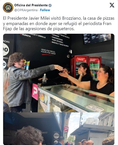 Mientras tanto, desde Casa Rosada prefirieron obviar la lluvia de insultos y subieron a la cuenta de la Oficina del Presidente imágenes de Milei comprando empanadas y saludando a las empleadas del lugar.
