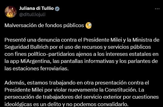 Di Tullio radicó la denuncia en el juzgado Criminal y Correccional Federal 4 por la presunta comisión del delito de peculado de servicios, para lo que se solicitó que se produzcan acciones de prueba frente al uso de recursos y servicios públicos con claros fines político-partidarios ajenos a los intereses estatales.