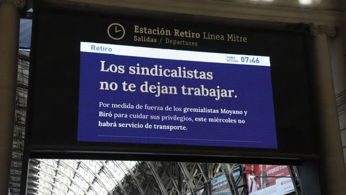 Frente al contundente paro de transportes del miércoles, el gobierno de Javier Milei avanzó, una vez más, con el hostigamiento a los sindicalistas. A través de la aplicación Mi Argentina y en las pantallas informativas del ferrocarril se responsabilizó de la medida de fuerza al secretario Adjunto del gremio de Camioneros, Pablo Moyano, y el titular de Asociación de Pilotos de Líneas Aéreas (APLA), Pablo Biró.