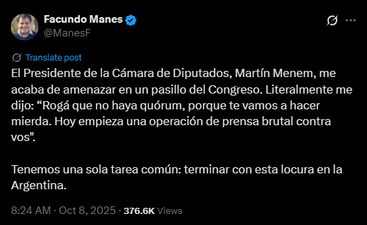 “El presidente de la Cámara de Diputados, Martín Menem, me acaba de amenazar en un pasillo del Congreso”, posteó Manes, quien al contar el altercado llamó a “terminar con esta locura en la Argentina”.