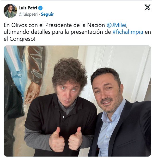 16/01/2025.- www.eldiarioar.com.- Por María Cafferata.-Foto portada: Luis Petri y Javier Milei en el despacho presidencial, en un tuit que el ministro publicó revelando que trabajaba con el Presidente en Ficha Limpia.