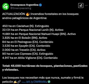 De acuerdo a datos oficiales, los incendios arrasaron hasta la fecha 11.661 hectáreas en el parque nacional Nahuel Huapi de Río Negro y 22.131 hectáreas en el parque nacional Lanín de Neuquén -aunque Greenpeace advierte que en este último podrían ser más, ya que hace tres días que no se difunden datos nuevos.