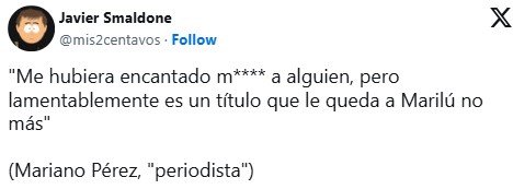 «Desde que mató personalmente un empleado de la AFIP está muy domadora», comenzó el recorte de Pérez que se hizo viral en X. «Me hubiera encantado matar a alguien pero, lamentablemente, es un título que le queda a Marilú nomás», agregó el youtuber.