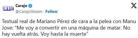 Tanto el periodista Manu Jove como Pérez confirmaron que pelearán en la velada de boxeo que organiza año a año el humorista y streamer Luquita Rodríguez. De hecho, el influencer libertario confirmó en Carajo que ya comenzó a entrenar. «Tengo ocho meses para convertirme en una máquina de matar», dijo.
