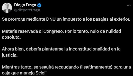 El abogado Diego Fraga, profesor de la maestría en Derecho Tributario de la Universidad Austral, consideró que la prórroga por DNU es de «nulidad absoluta», aunque también estimó que será difícil la judicialización.