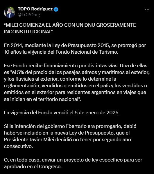 «Ese DNU es groseramente inconstitucional, porque el Fondo contiene el tributo del 5% sobre el precio de los pasajes, cuando la Constitución le prohíbe al Poder Ejecutivo legislar por DNU en materia tributaria», opinó este lunes el ex diputado nacional Alejandro «Topo» Rodríguez.