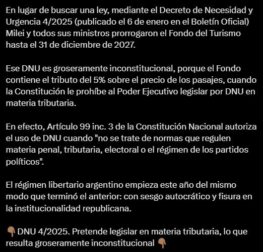 La decisión del Gobierno de prorrogarlo por DNU abre un debate acerca de su legalidad, ya que es inconstitucional legislar en materia tributaria mediante DNU. El argumento oficial es que hasta 2027 estaba aprobada la asignación específica del tributo.