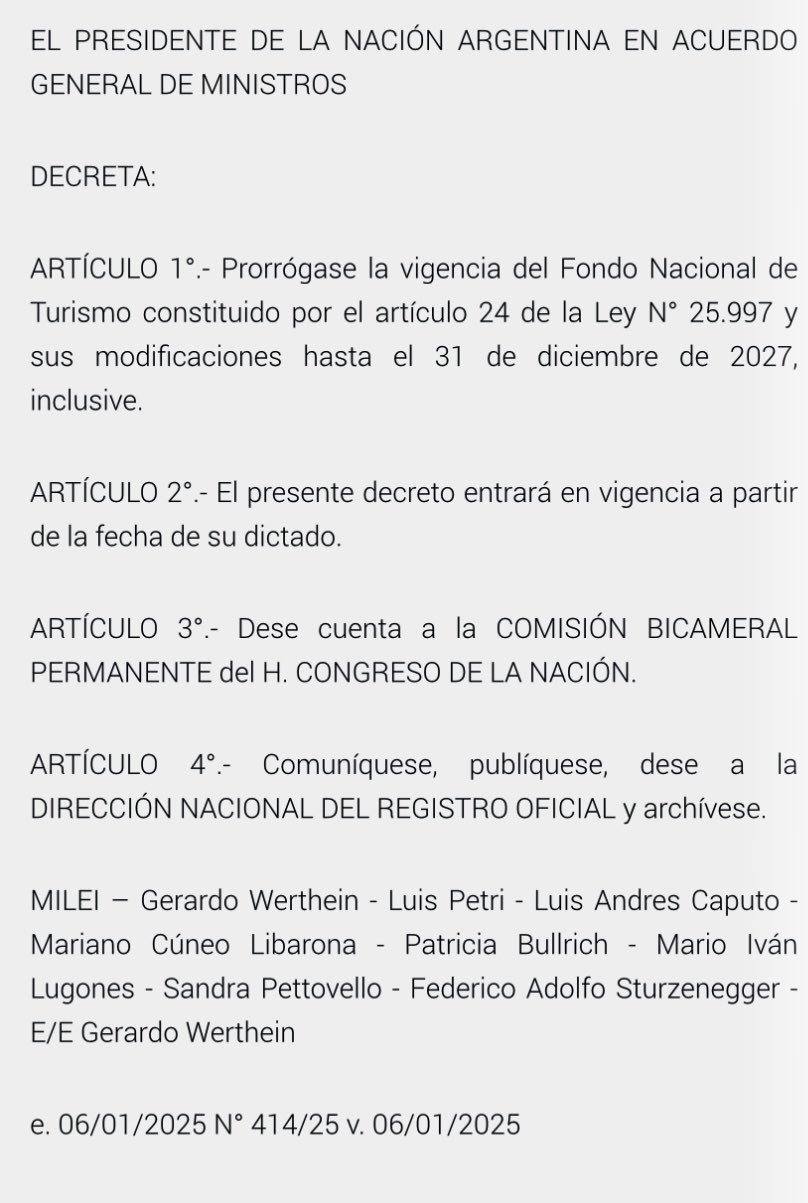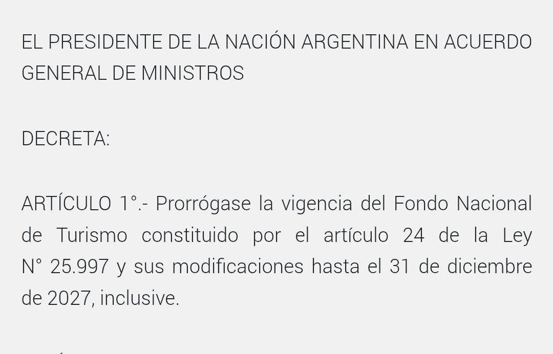 A través de un Decreto de Necesidad y Urgencia publicado este lunes en el Boletín Oficial,  el Gobierno extendió hasta el 31 de diciembre de 2027 la vigencia del Fondo Nacional de Turismo, que se financia entre otras cosas por el impuesto conocido como «DNT».