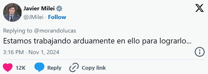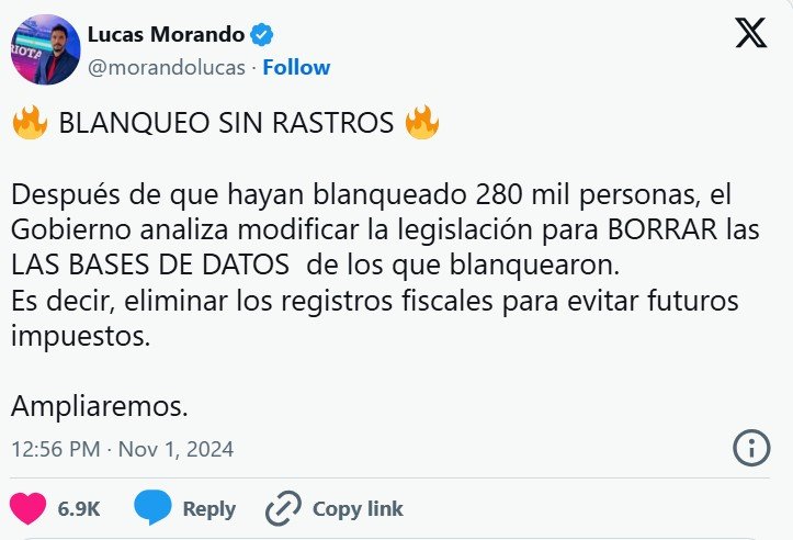«Estamos trabajando arduamente en ello para lograrlo», respondió Milei al posteo de Lucas Morando, quien escribió en su cuenta de X: “Después de que hayan blanqueado 280 mil personas, el Gobierno analiza modificar la legislación para BORRAR las LAS BASES DE DATOS de los que blanquearon. Es decir, eliminar los registros fiscales para evitar futuros impuestos”.