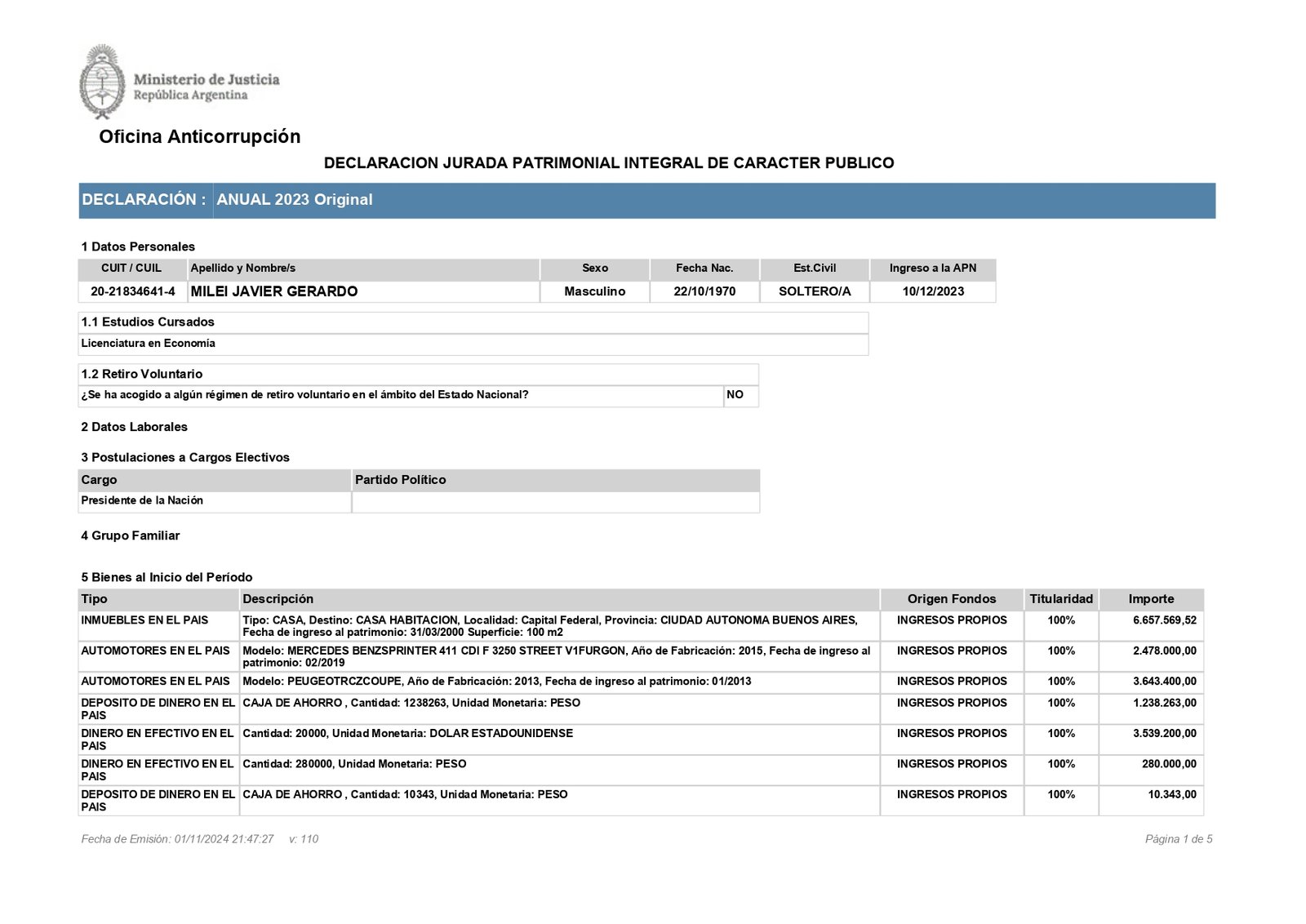 La presentación oficial detalla las diferencias entre el inicio del 23 con el cierre del mismo año, ya cuando Milei se calzó la banda presidencial. Según las planillas, Milei arrancó el año con un inmueble a su nombre en Capital Federal, dos autos de alta gama (una Mercedez Benz Sprinter y un Peugeot RCZ). A eso se le sumaban cuentas bancarias tanto en pesos como en dólares. En la primera, Milei decía tener 2.766.860 pesos divididos en tres cajas; sobre la moneda extranjera registraba 20.000 dólares, que implicaban 3.539.200 pesos.
