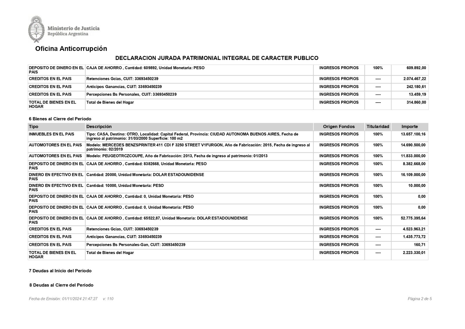 Si sumamos la valorización de sus inmuebles, sus vehículos y las cuentas bancarias, su fortuna era, al principio de año, de 21 millones de pesos.
