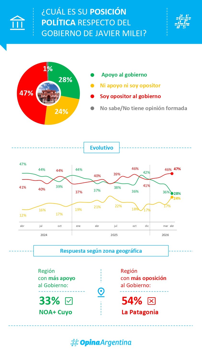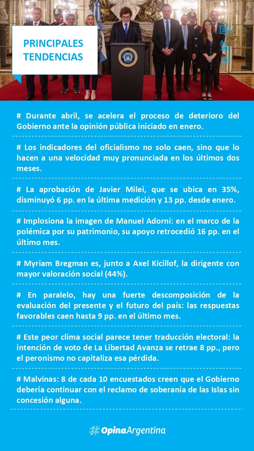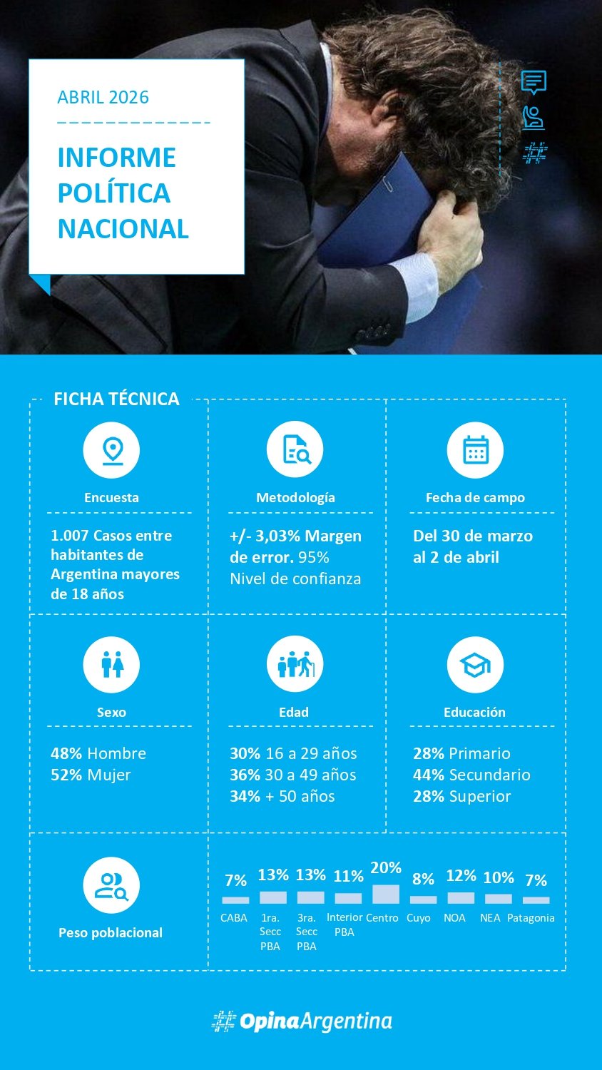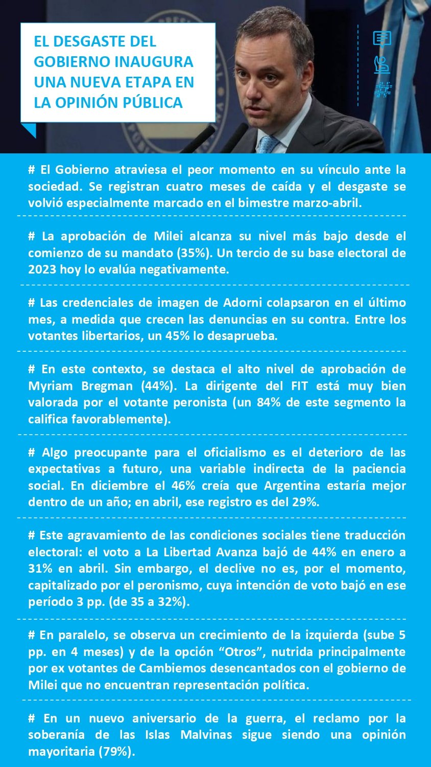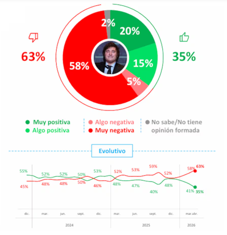 El relevamiento, realizado entre el 30 de marzo y el 2 de abril sobre más de mil casos, confirma lo que en el oficialismo ya no pueden ocultar. “Durante abril se acelera el proceso de deterioro del Gobierno ante la opinión pública iniciado en enero”, advierte el estudio. La caída no es gradual: es brusca. La aprobación de Milei se ubica en 35%, seis puntos menos que en la última medición y trece por debajo de enero. La imagen negativa trepa al 65%, el peor registro desde su llegada al poder.
