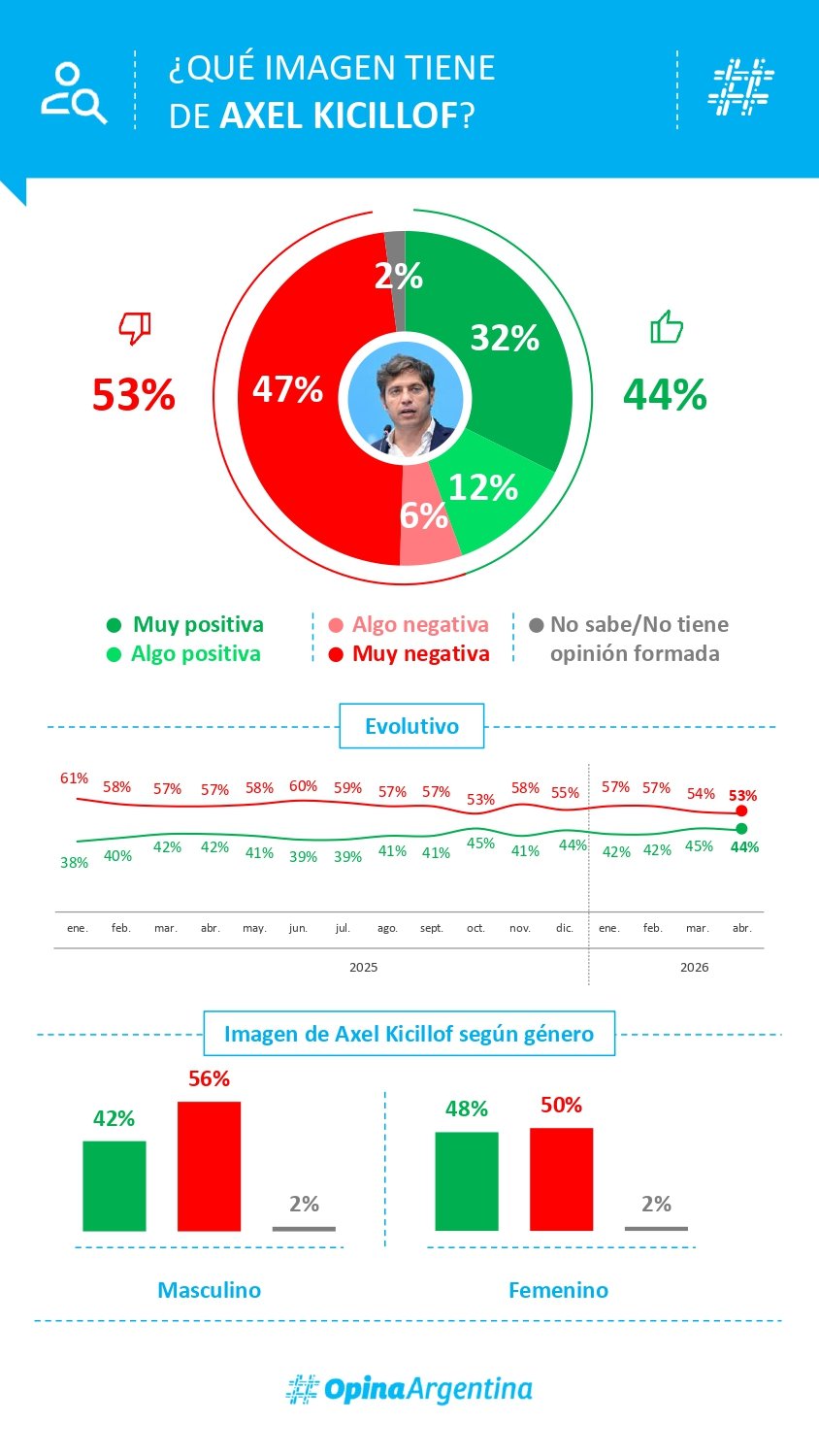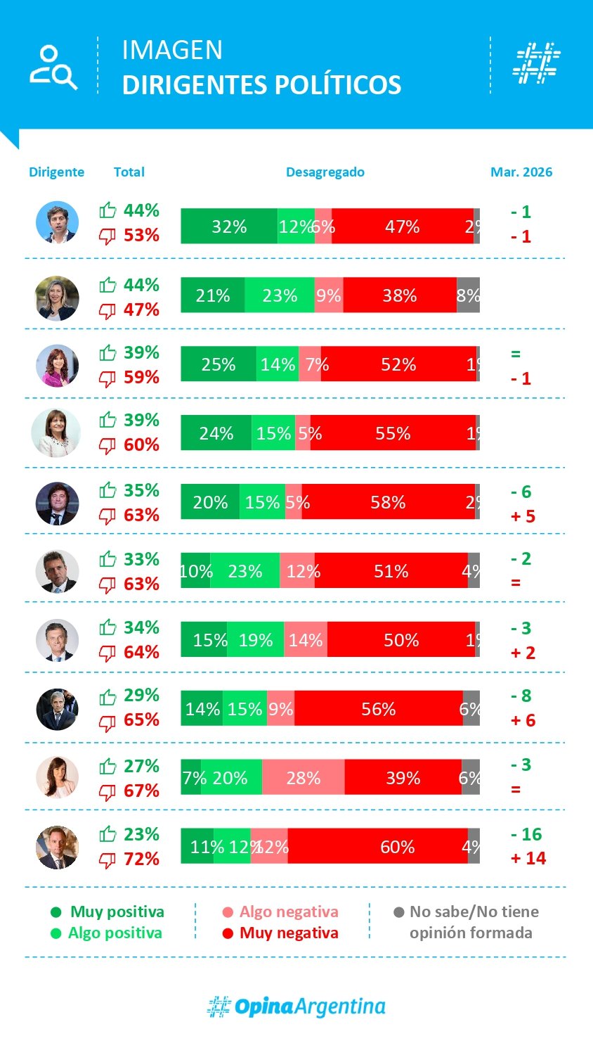 En el ranking de dirigentes, Axel Kicillof y Myriam Bregman encabezan con 44% de imagen positiva. El gobernador bonaerense amplía su base más allá del núcleo kirchnerista, mientras Cristina Kirchner se ubica en 39%, el mismo porcentaje que Patricia Bullrich, que incluso supera al propio Milei.