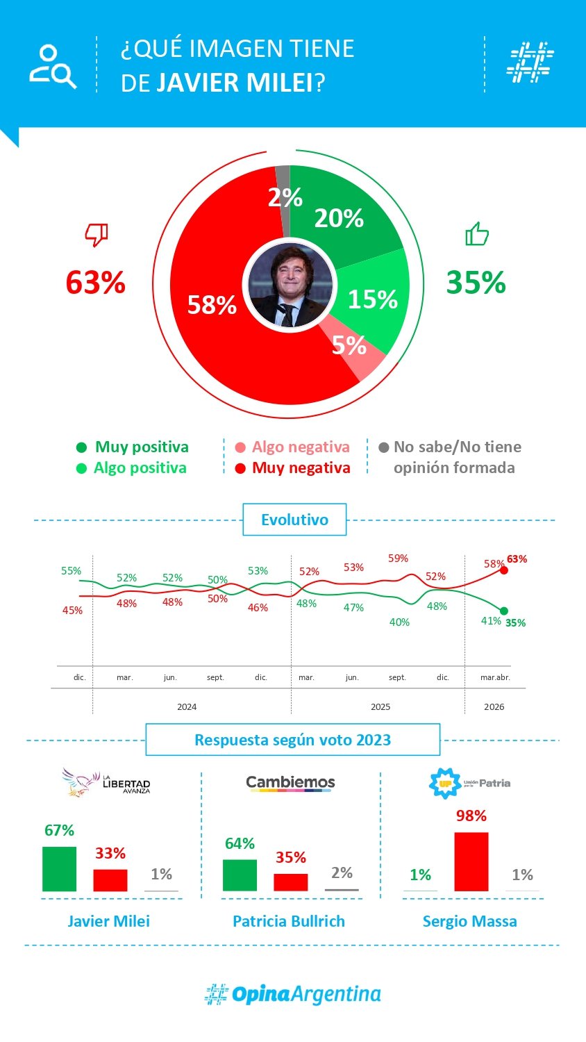 El derrumbe ya no se disimula. En medio de la crisis económica y los escándalos de corrupción, la imagen de Javier Milei se desploma incluso en los sondeos más cercanos a su propio entorno. Un informe de la consultora Opina Argentina, dirigida por Facundo Nejamkis, revela un dato contundente: el 63% de los argentinos rechaza al Presidente.