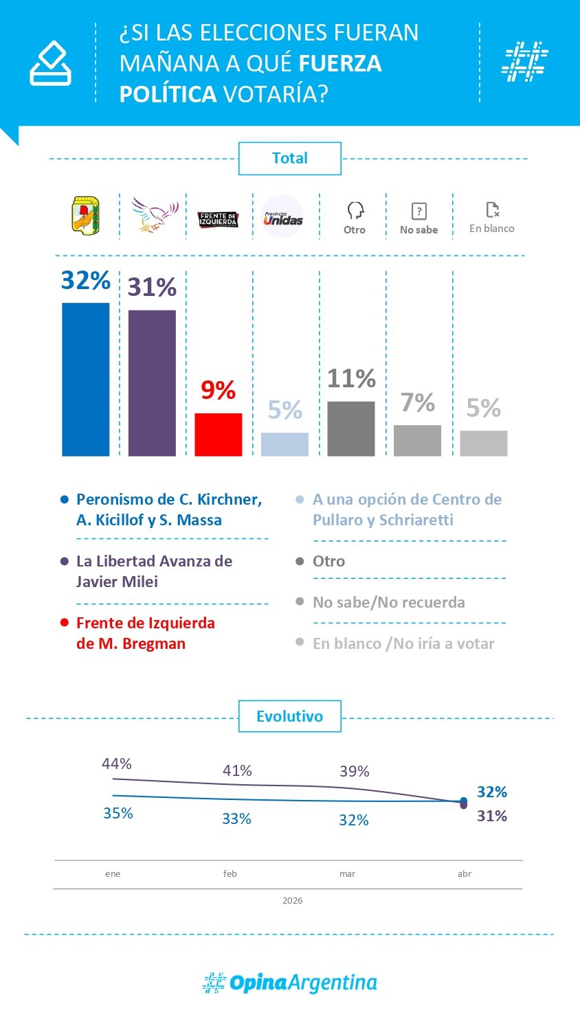 Sin embargo, el desgaste del oficialismo no se traduce en un crecimiento automático de la oposición. Según el informe, La Libertad Avanza pierde ocho puntos, pero el peronismo no logra capitalizar ese retroceso. Si las elecciones fueran hoy, el 32% votaría al PJ y el 31% a LLA. El Frente de Izquierda aparece con un 11%, mientras un 18% se refugia en el “otro” o el “no sabe”, configurando un escenario fragmentado e incierto.