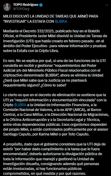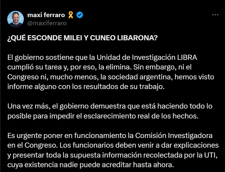 No fue el único que salió a cuestionar la medida del gobierno. “Se caen las caretas sobre el compromiso con la transparencia. Expertos en impunidad”, describió Esteban Paulón, legislador de Encuentro Federal. Así salió a criticar el Decreto 332/2025 publicado en el Boletín Oficial para eliminar la unidad que dependía del Ministerio de Justicia. También Maximiliano Ferraro, presidente de la Coalición Cívica, siguió la misma línea: “Una vez más, el gobierno demuestra que está haciendo todo lo posible para impedir el esclarecimiento real de los hechos”.