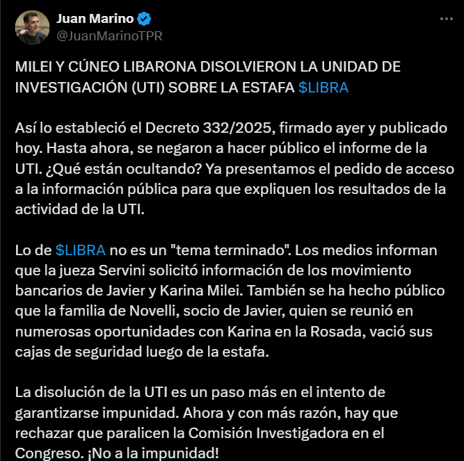 Después de que se conociera que el gobierno resolvió cerrar la Unidad de Tareas de Investigación (UTI) para investigar la supuesta estafa $LIBRA, representantes políticos de diversos espacios advirtieron que el Poder Ejecutivo intenta garantizar la impunidad. “Ahora y con más razón, hay que rechazar que paralicen la Comisión Investigadora en el Congreso”, apuntó Juan Marino, diputado de Unión por la Patría (UP).