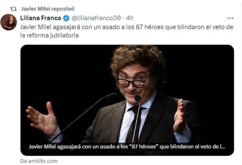 En sus redes sociales, Milei compartió una publicación del medio Ámbito Financiero, donde se asegura que el mandatario agasajará a los «87 héroes» que blindaron el veto de la reforma jubilatoria. «El mandatario está muy contento con el apoyo recibido por parte del PRO y un sector del radicalismo para mantener el veto a la reforma previsional», se expresa en el artículo reposteado por el Presidente.