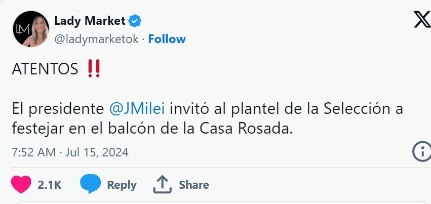 Sin embargo, Milei no se animó a una invitación oficial a la Selección sino solo a una declaración radial, que luego replicó por redes con la ayuda de los trolls habituales. La foto es imposible porque los jugadores de la Selección no pensaban regresar juntos al país, pero de todas maneras Milei evitó quedar mal parado como lo ocurrió al presidente Alberto Fernández, que convocó a los jugadores tras la victoria en el Mundial y recibió un rechazo del plantel para visitar la Casa Rosada.