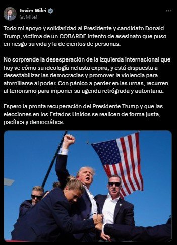 Milei tuiteó, tras el ataque a Trump, que se trataba de un acto de la “izquierda internacional” y sugirió además que los demócratas podrían estar detrás. “No sorprende la desesperación de la izquierda internacional que hoy ve cómo su ideología nefasta expira, y está dispuesta a desestabilizar las democracias y promover la violencia para atornillarse al poder. Con pánico a perder en las urnas, recurren al terrorismo para imponer su agenda retrógrada y autoritaria” escribió en las redes.