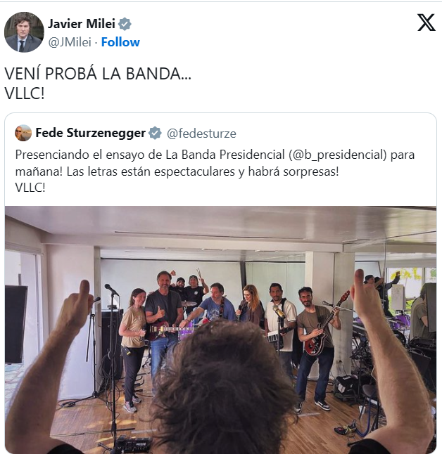 «VENÍ PROBÁ LA BANDA…», tuiteó Milei y recibió cientos de comentarios negativos en las redes. «El Javo invitando al mercado a probar la banda superior», tuiteó El Soberano. «La banda la tenés en Balcarce 50», añadió Jorginho. «La orquesta del Titanic», comparó Pablo Perazzo.