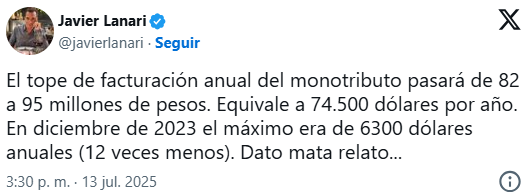 El tope de facturación anual del monotributo pasará de 82 a 95 millones de pesos, anunció el subsecretario de Prensa de la Presidencia, Javier Lanari. El funcionario dijo que “equivale a 74.500 dólares por año”. Y recordó que “en diciembre de 2023 (cuando asumió el gobierno de Javier Milei), el máximo era de 6.300 dólares anuales (12 veces menos)”.