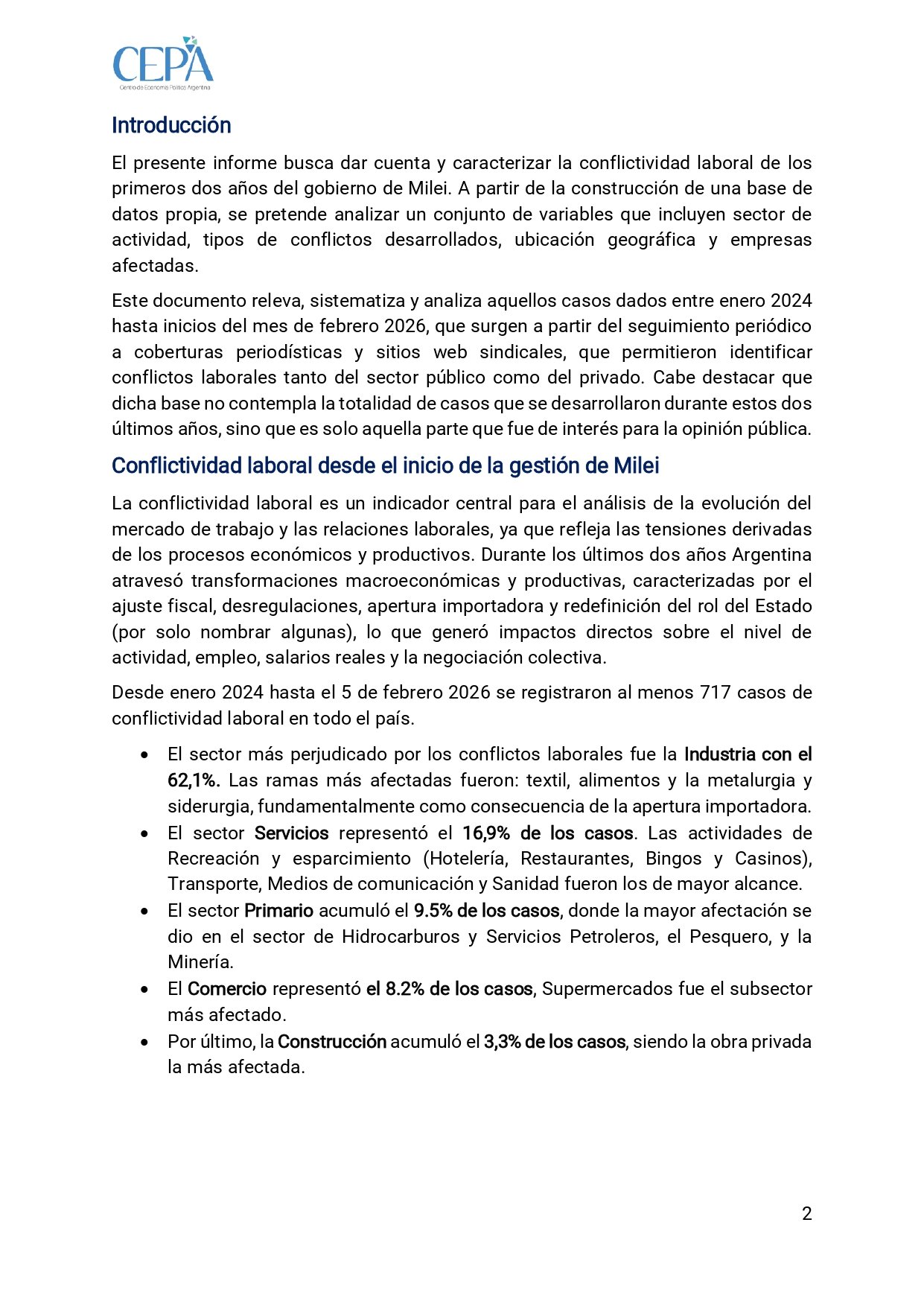 A dos años del experimento libertario, el mercado laboral argentino no muestra señales de “liberación” sino de implosión. El informe “Conflictividad laboral a 2 años del gobierno de Javier Milei”, elaborado por el CEPA con datos relevados entre enero de 2024 y febrero de 2026, registra al menos 717 casos de conflictos laborales en todo el país. No se trata de una percepción ni de una consigna sindical: son casos sistematizados a partir de medios y organizaciones gremiales, y aun así el propio documento advierte que no abarcan la totalidad de los episodios ocurridos.