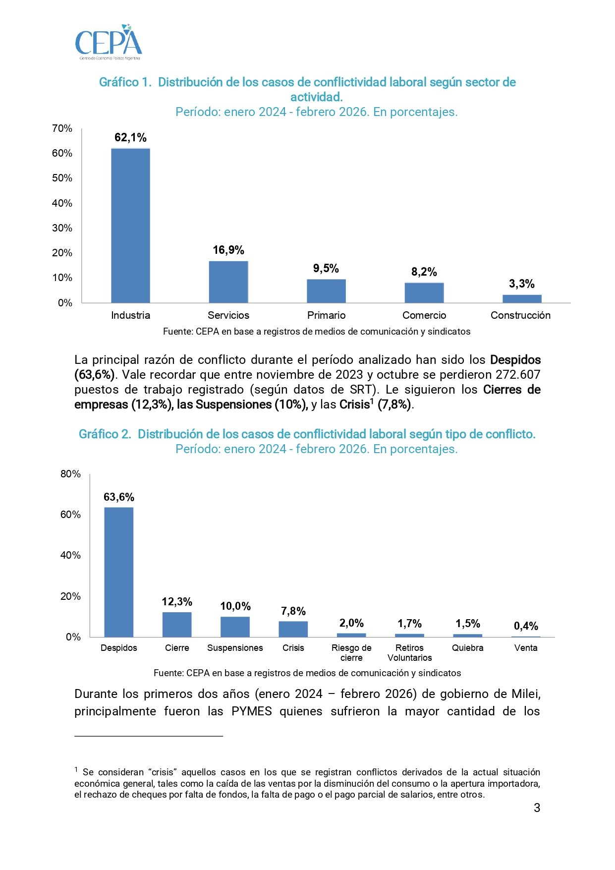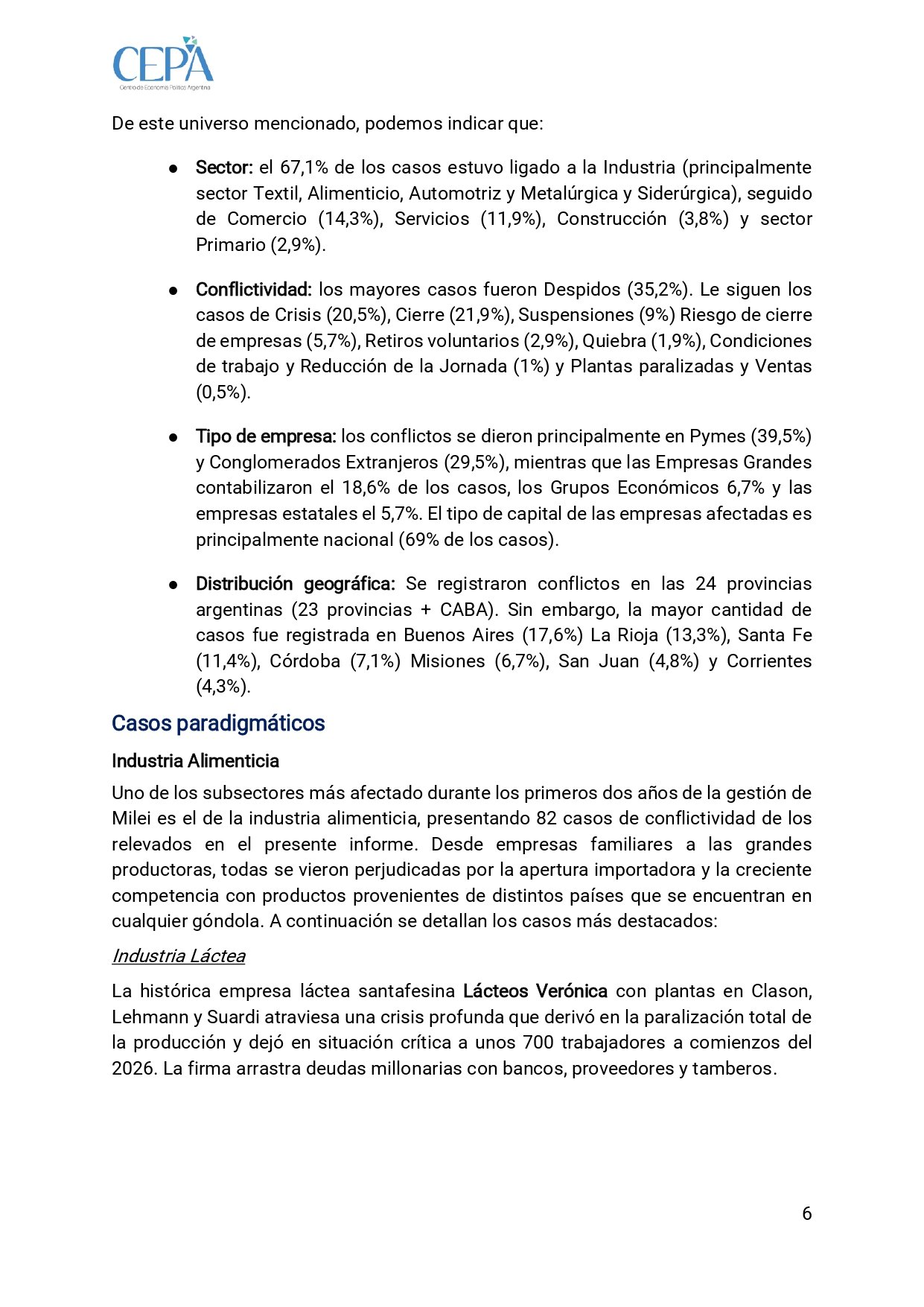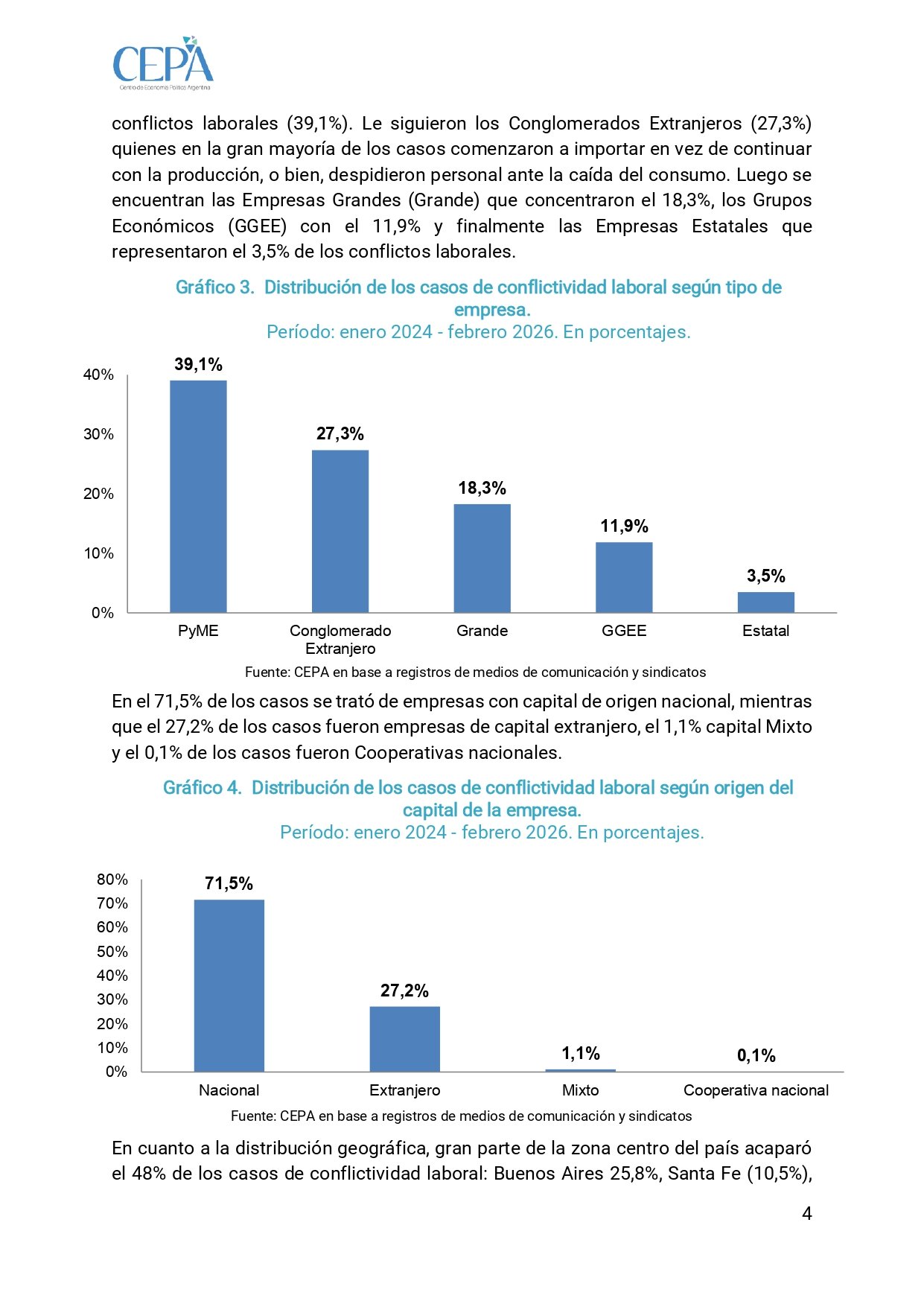 Las PYMES fueron el blanco principal: 39,1 % de los conflictos. Les siguen conglomerados extranjeros (27,3 %), grandes empresas (18,3 %), grupos económicos (11,9 %) y estatales (3,5 %). El 71,5 % de las firmas involucradas son de capital nacional. El “costo argentino” terminó siendo, en muchos casos, el propio trabajador.