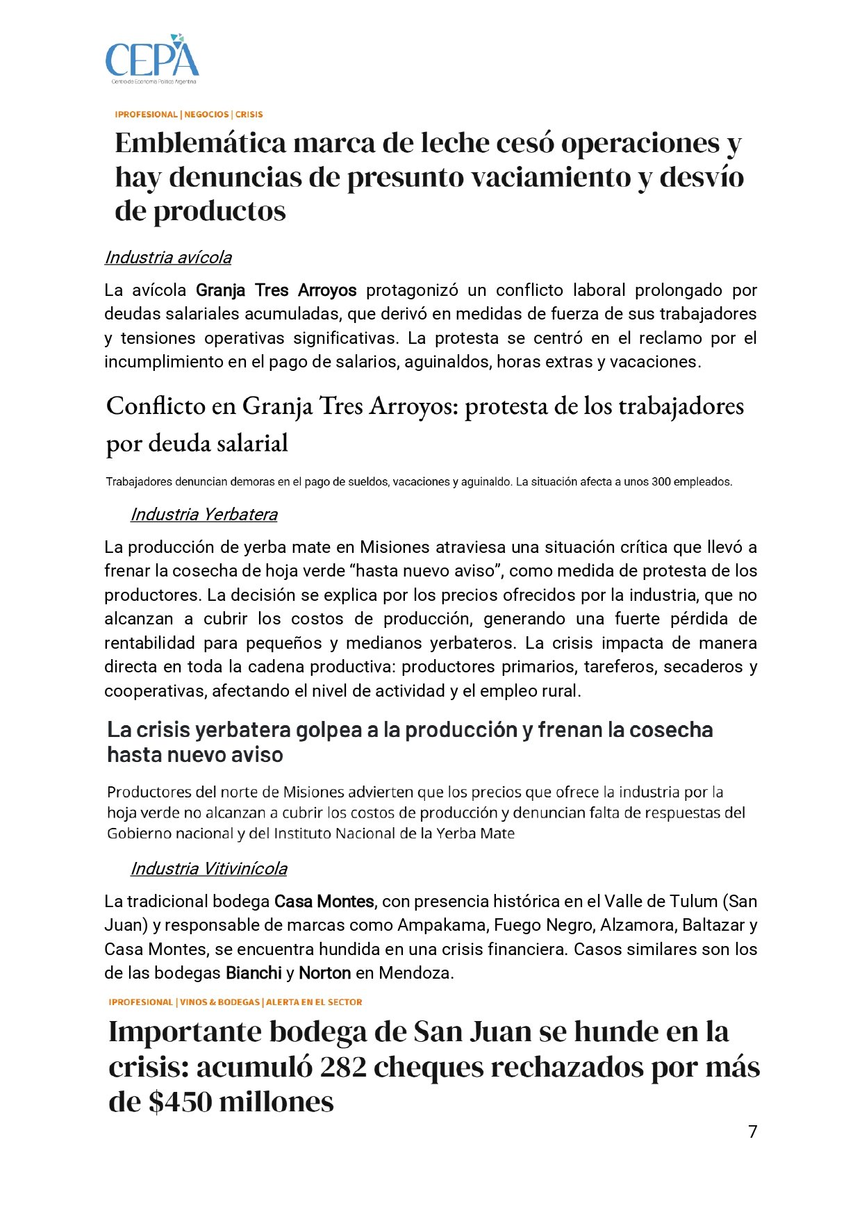 En la industria alimenticia, uno de los subsectores más golpeados con 82 casos relevados, la histórica Lácteos Verónica paralizó totalmente su producción y dejó a unos 700 trabajadores en situación crítica a comienzos de 2026, con deudas millonarias acumuladas. En la avícola, Granja Tres Arroyos arrastró un conflicto prolongado por deudas salariales, aguinaldos y horas extras impagas. En Misiones, la producción de yerba mate frenó la cosecha “hasta nuevo aviso” por precios que no cubren costos, afectando a productores, tareferos y cooperativas. En la vitivinicultura, Casa Montes se hunde en una crisis financiera, con antecedentes similares en Bianchi y Norton.
