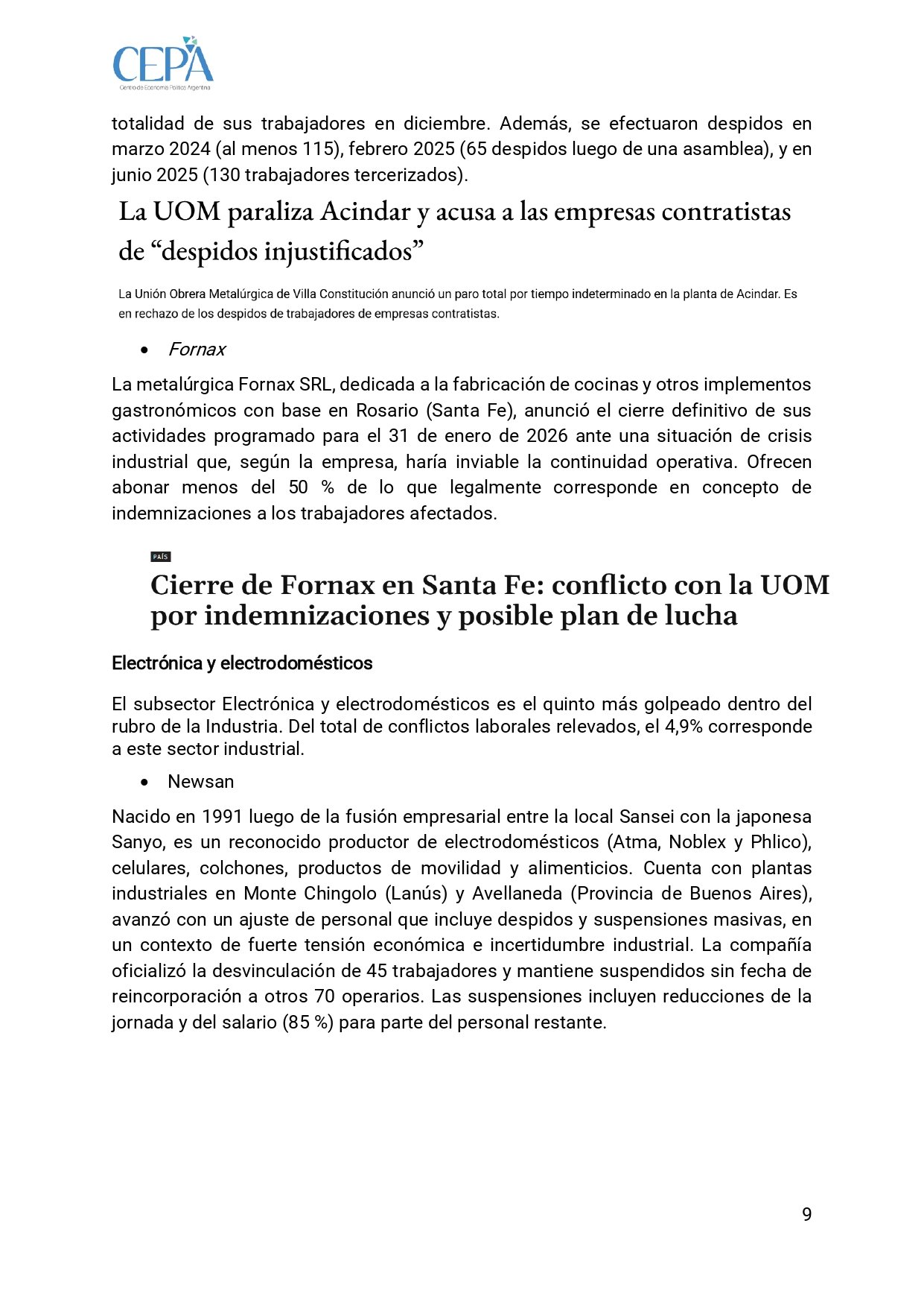 En la metalurgia y siderurgia, que representa el 12,8 % de los conflictos industriales, Acindar aplicó miles de suspensiones: 1.700 en febrero de 2024, 3.000 en marzo, 460 en junio; en 2025 sumó 980 en febrero, 600 en julio y septiembre, 200 en octubre y casi la totalidad del personal en diciembre. Además, hubo despidos en marzo de 2024 (115), febrero de 2025 (65) y junio de 2025 (130 tercerizados). Fornax anunció el cierre definitivo para el 31 de enero de 2026 y ofreció pagar menos del 50 % de las indemnizaciones legales.
