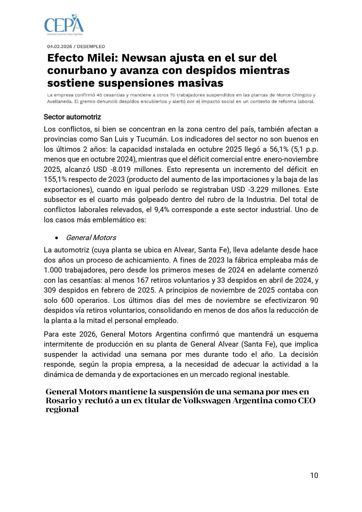 En electrónica, Newsan oficializó la desvinculación de 45 trabajadores y mantiene 70 suspendidos sin fecha de reincorporación, con reducciones de jornada y salario al 85 %. En el sector automotriz, la capacidad instalada cayó al 56,1 % en octubre de 2025 y el déficit comercial del sector alcanzó los 8.019 millones de dólares entre enero y noviembre de ese año, un salto del 155,1 % respecto de 2023. General Motors redujo su planta de más de 1.000 trabajadores a 600 en menos de dos años, con 167 retiros voluntarios y 33 despidos en abril de 2024, 309 despidos en febrero de 2025 y otros 90 retiros en noviembre.