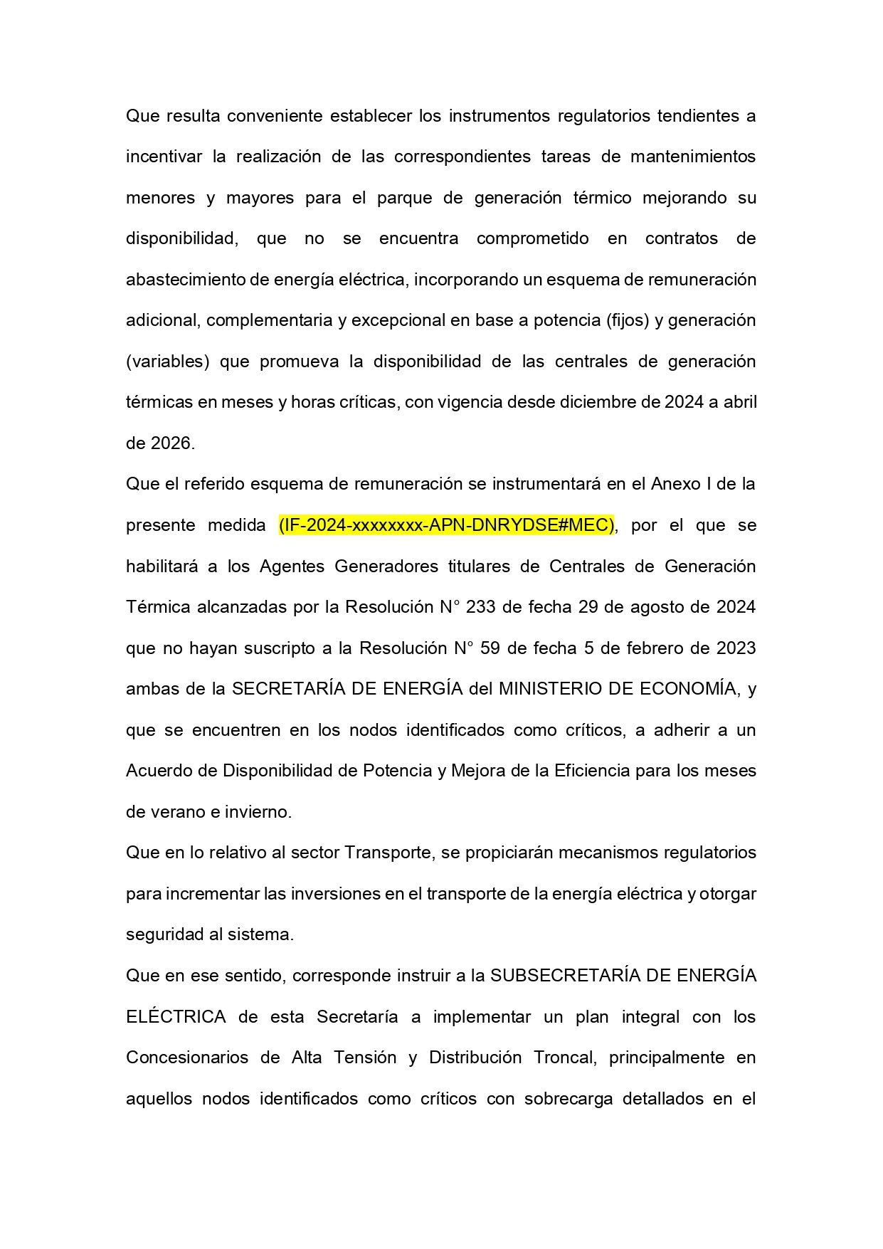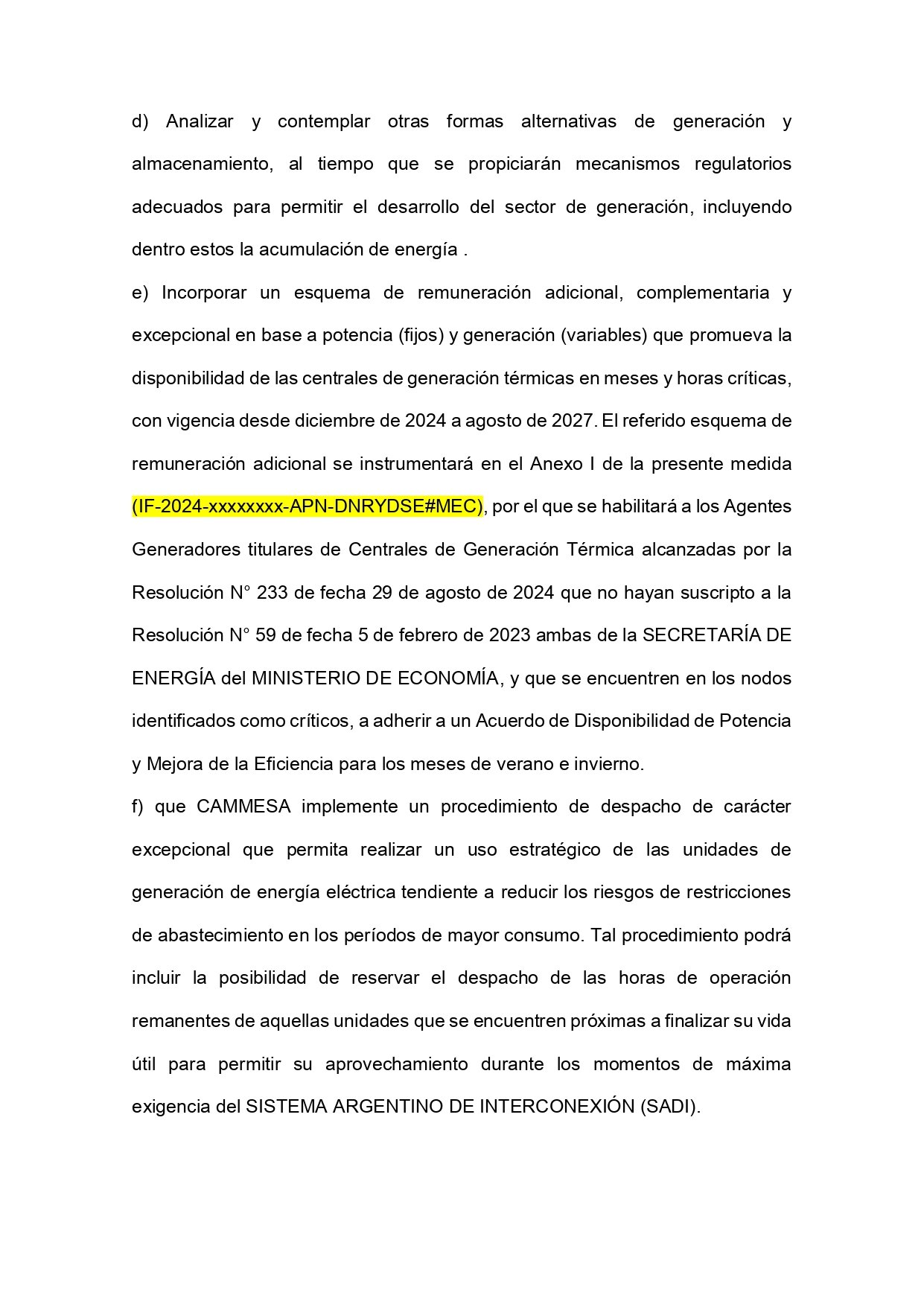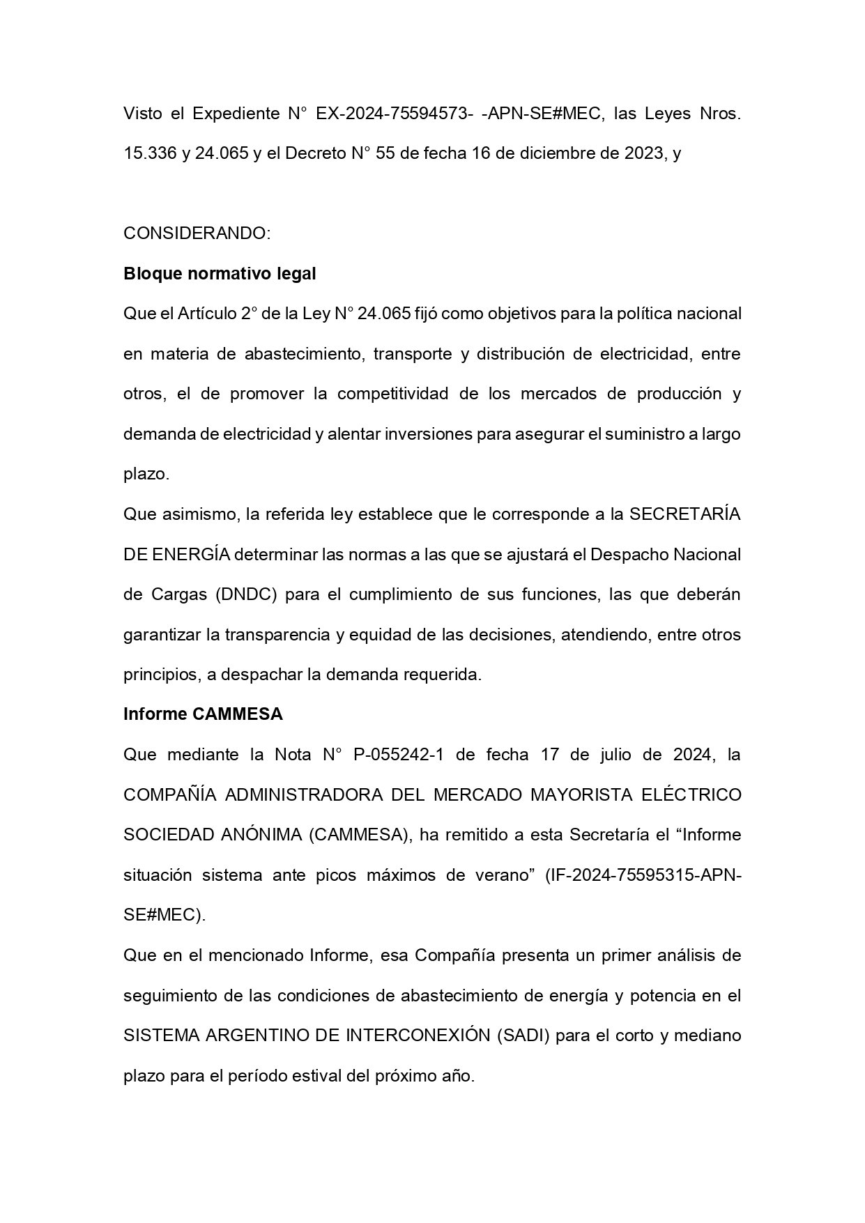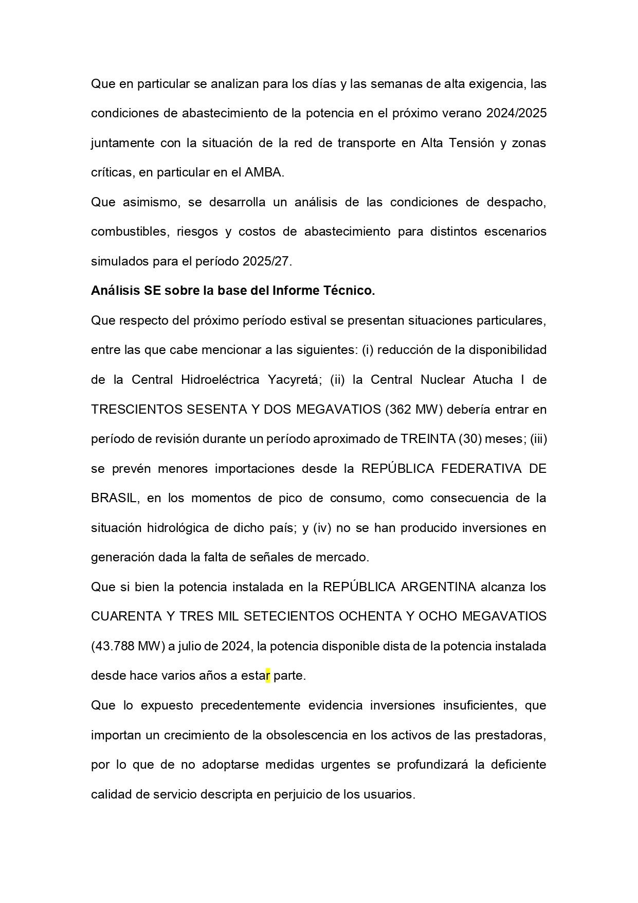 Actualmente la potencia instalada en la Argentina alcanza los 43.788 MW a julio de 2024, pero según la secretaria de Energía «la potencia disponible dista de la potencia instalada desde hace varios años a estar parte» argumentan en el borrador de la resolución.