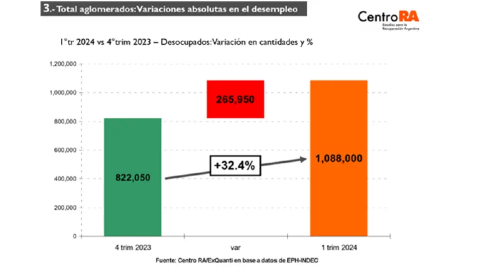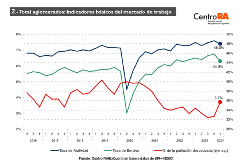 Además, se advierte por el crecimiento de la desocupación durante los primeros tres meses de la gestión de Milei. «Es alarmante observar el crecimiento de 32.4% de desocupación entre el cuarto trimestre de 2023 y el primer trimestre de 2024, que nos deja con una totalidad de 1.088.000 desocupados en total», detalló el instituto. En el informe se destaca que el empleo está en números similares a la pandemia y se plantea que en la última medición oficial «404.000 personas dejaron de estar ocupadas», lo que representa «un descenso de 3 puntos entre el cuarto trimestre de 2023 y el primero de 2024». «El nivel del empleo está en niveles similares al momento de la salida de la pandemia (tercer trimestre del 2021). Correlativamente, la tasa de desocupación crece proporcionalmente más que lo que desciende la tasa de empleo y actividad».