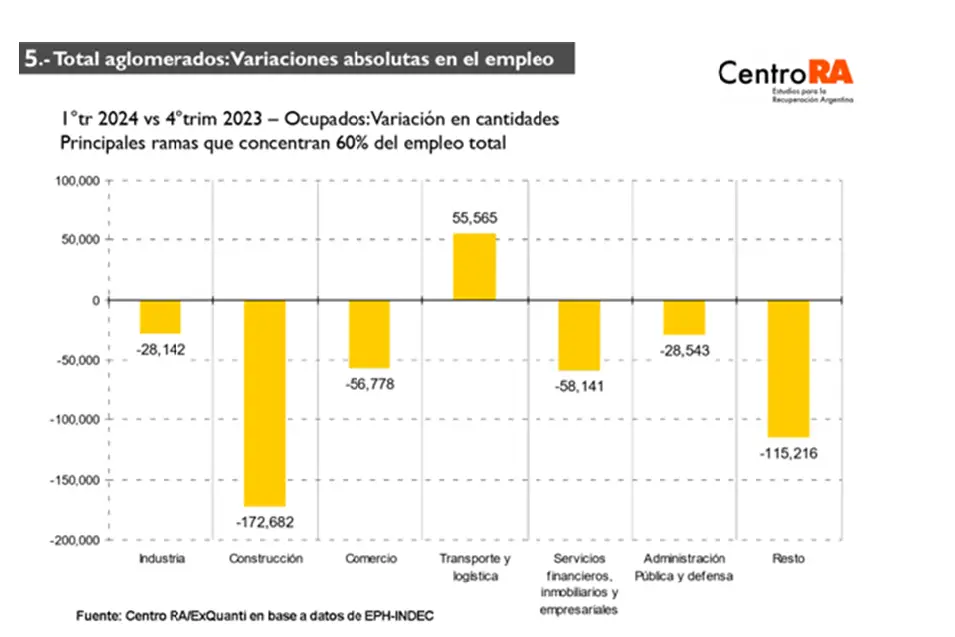 Por otro lado, el trabajo concluye que «para comprender la caída del empleo y su impacto en el nivel de ingresos debemos prestar atención a las ramas donde se han registrado los mayores descensos. «El rubro de la construcción concentra el 42.7% de los empleos perdidos. Este sector concentra altas tasas de precarización e informalidad. Entre las causas que explican la caída de este rubro en particular se encuentra la paralización de la obra pública», se añade.