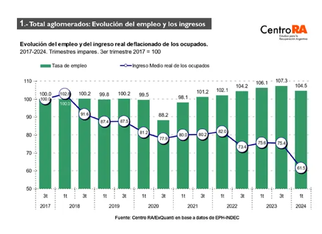 El centro para la Recuperación Argentina (RA) de la Universidad de Buenos Aires (UBA) alertó que el 35% de los trabajadores están bajo la línea de la pobreza y advirtió que en los primeros tres meses del Gobierno de Javier Milei la desocupación creció un 32,4% con respecto a diciembre. «Estamos frente a un récord creciente de personas que tienen trabajo pero son pobres», denuncia el instituto, que elaboró su informe en base a datos provistos por el INDEC para el primer trimestre del 2024.
