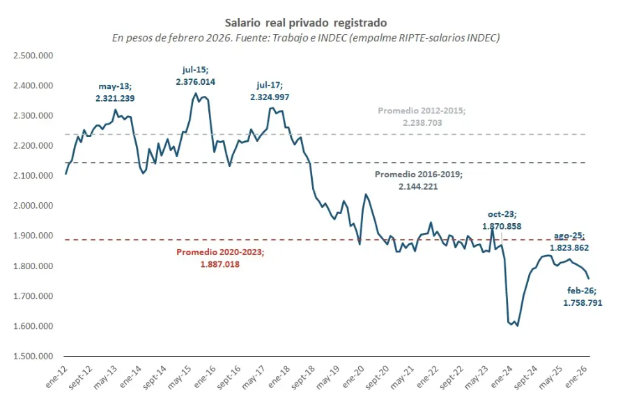Los ingresos, tanto en el sector público como en el privado, vienen ajustando por debajo de la inflación. El salario real de los trabajadores registrados acumula seis meses consecutivos de caída. De acuerdo con la Gerencia de Estudios Económicos del Banco Provincia, los salarios privados registrados retrocedieron 1,3 por ciento en febrero y acumulan una caída del 3,6 por ciento en los últimos seis meses, una dinámica comparable a períodos críticos como el primer semestre de 2018 o los meses iniciales de la pandemia.