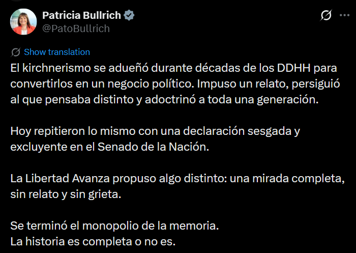 En ese contexto, Bullrich salió a justificar la postura del espacio y eligió una frase que volvió a abrir un viejo frente de discusión: “La historia es completa o no es”, dijo, en un intento de relativizar el terrorismo de Estado y reintroducir el argumento de los dos demonios en el debate público.