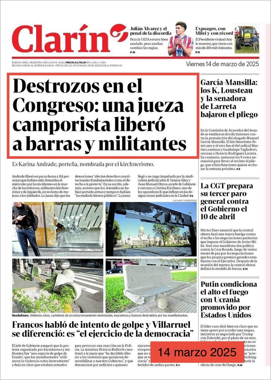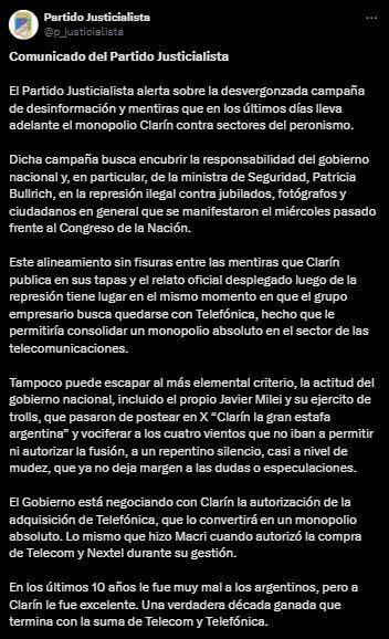 «Este alineamiento sin fisuras entre las mentiras que Clarín publica en sus tapas y el relato oficial desplegado luego de la represión tiene lugar en el mismo momento en que el grupo empresario busca quedarse con Telefónica, hecho que le permitiría consolidar un monopolio absoluto en el sector de las telecomunicaciones», dice el posteo.