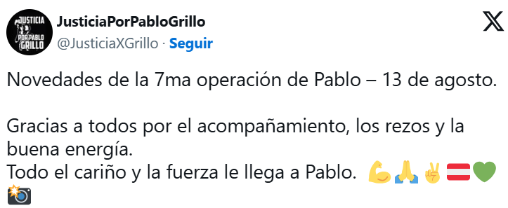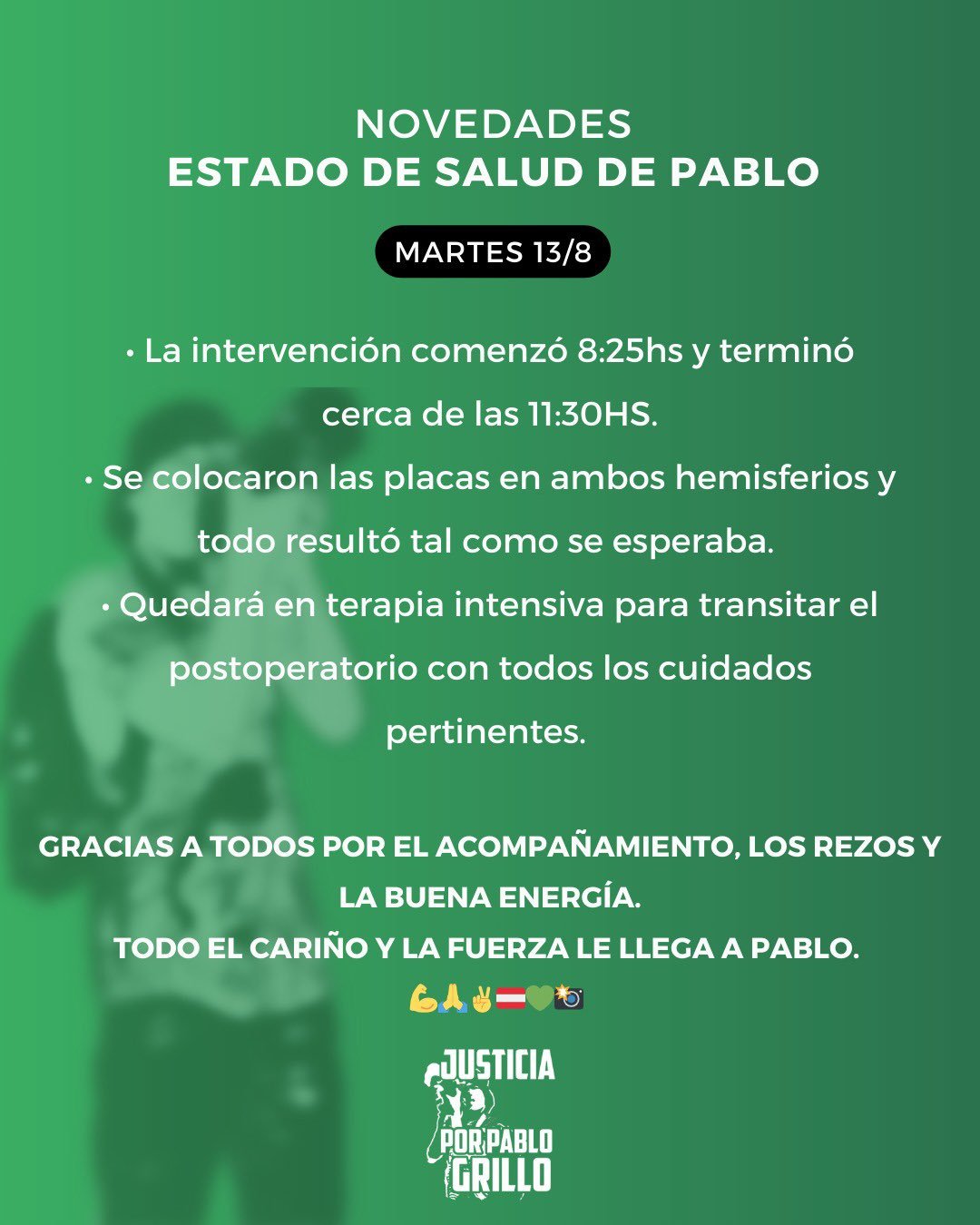 Según informó su familia a través de la cuenta “Justicia por Pablo Grillo” (@JusticiaXGrillo en X) la séptima operación concluyó con éxito. En el posteo señalaron que “la intervención comenzó a las 8:25 y terminó a las 11:30” y que los médicos “colocaron las placas en ambos hemisferios y todo resultó tal como se esperaba”.