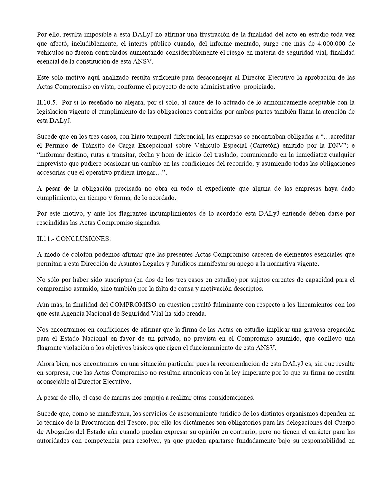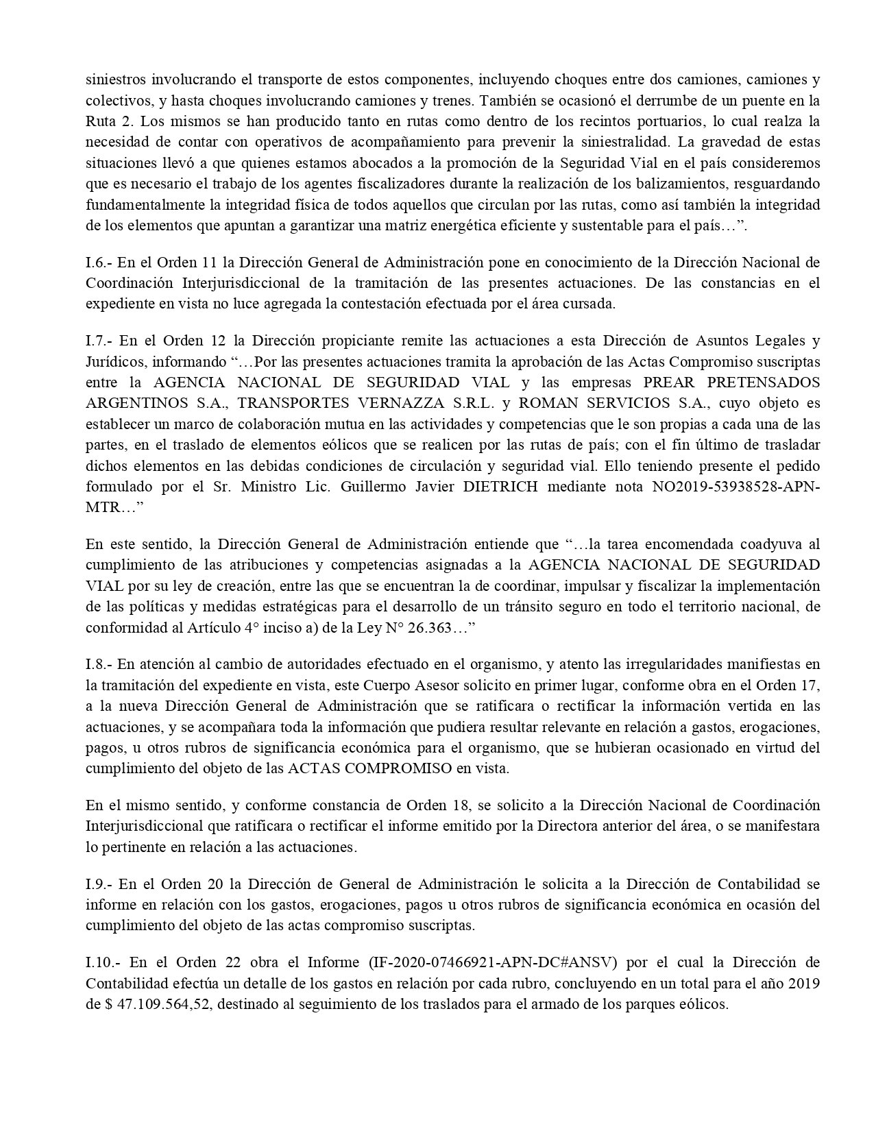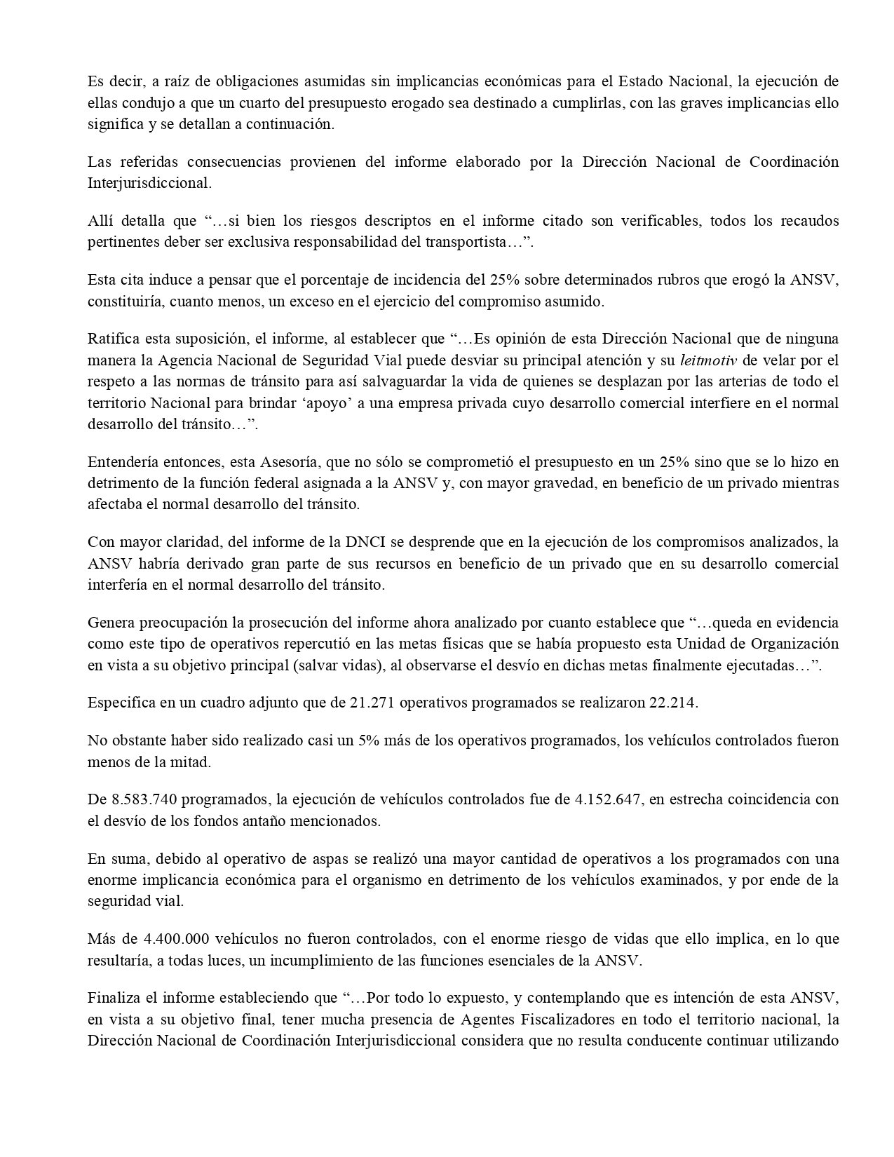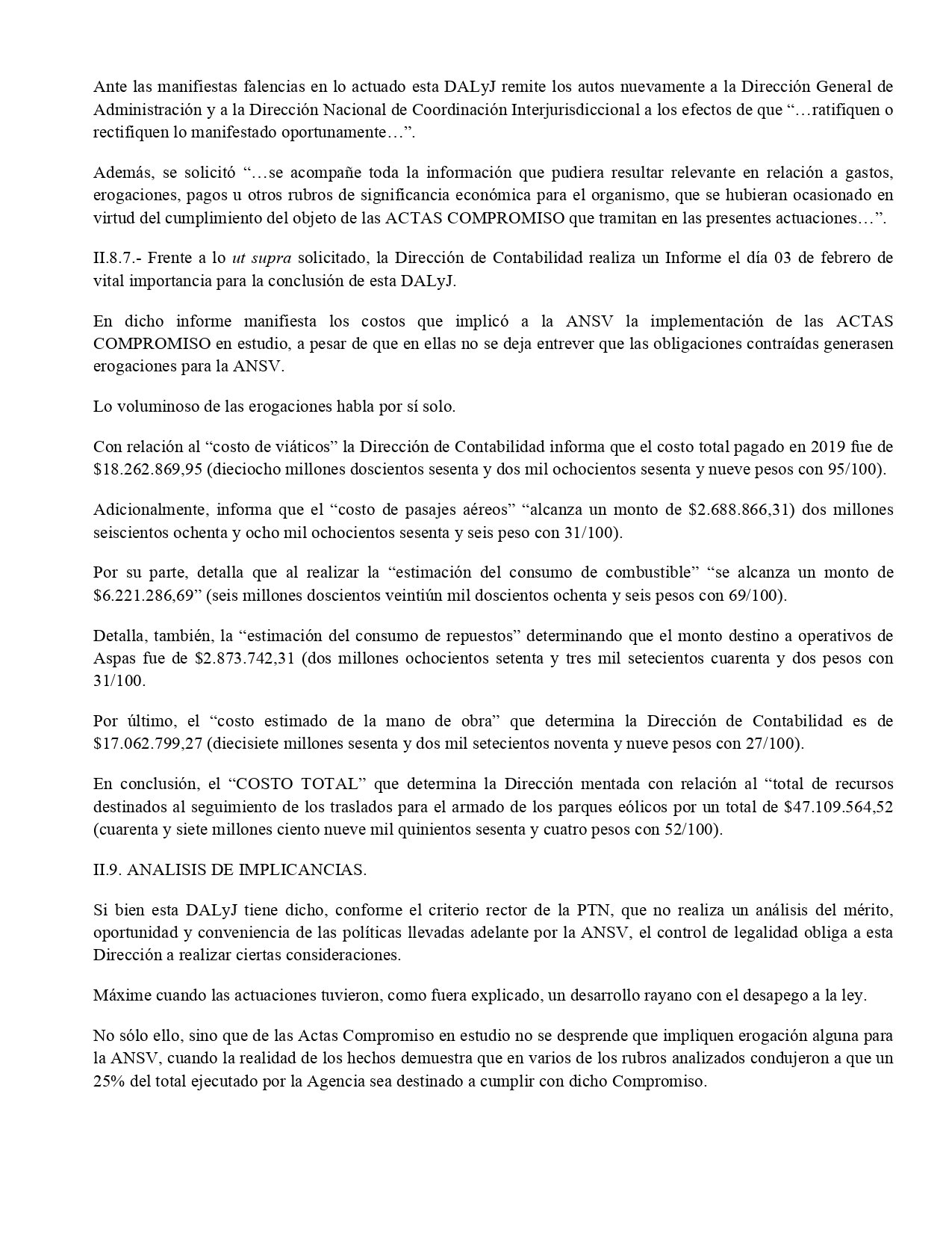 El costo para la Agencia fue de una cuarta parte de su presupuesto total. «De las Actas Compromiso en estudio no se desprende que impliquen erogación alguna para la ANSV, cuando la realidad de los hechos demuestra que en varios de los rubros analizados condujeron a que un 25% del total ejecutado por la Agencia sea destinado a cumplir con dicho compromiso», dice el dictamen jurídico que analizó la gestión del macrismo en la Agencia.