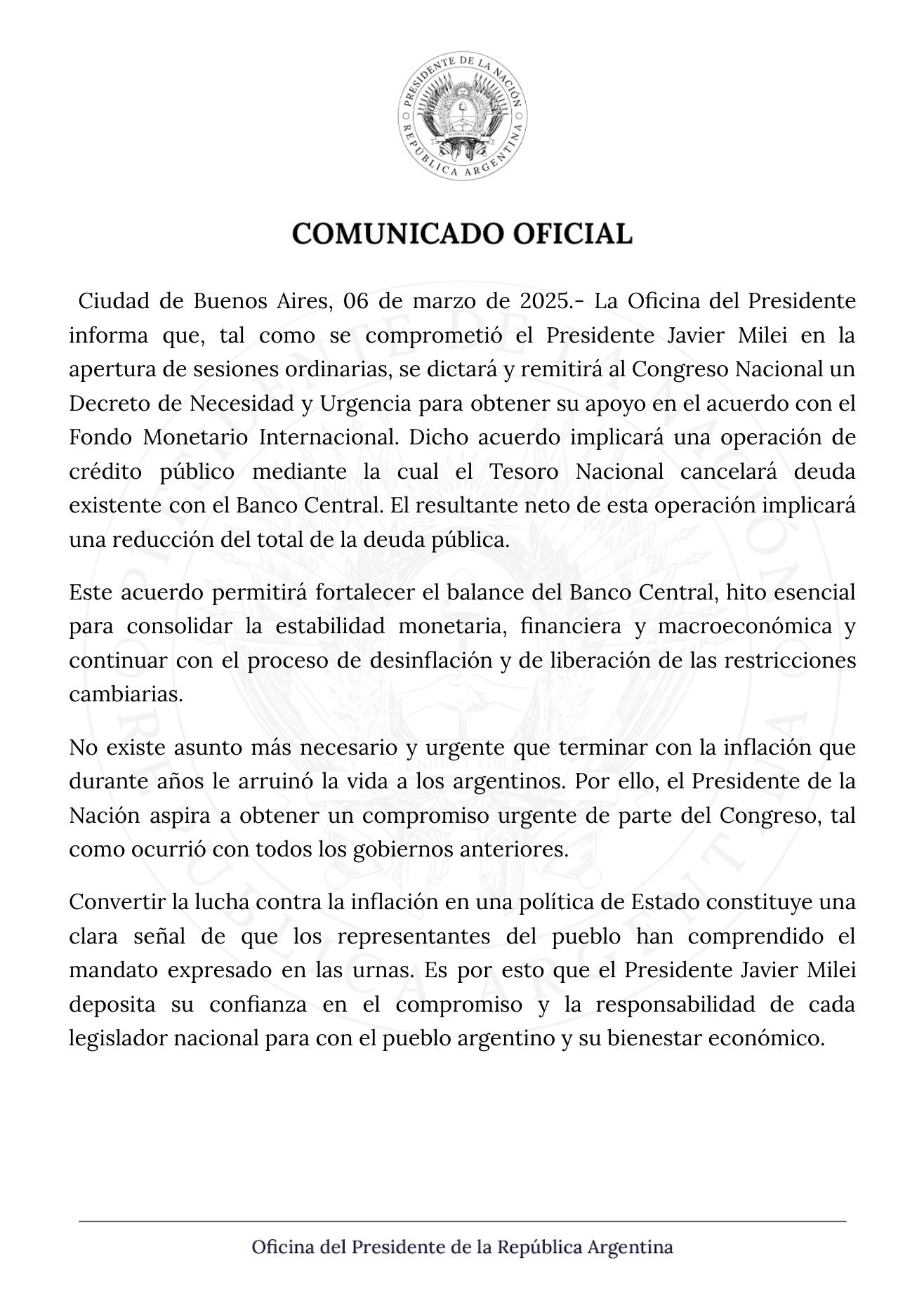 Esto es así porque a diferencia de las leyes que no rigen hasta que son sancionadas por las dos cámaras, los decretos están vigentes hasta que ambas cámaras los rechazan. Y previamente se debe convocar y emitir dictamen la bicameral de Trámite Legislativo. Un camino tortuoso que le da la ventana temporal que necesita Milei, para cerrar el acuerdo y al mismo tiempo mostrarle al FMI que se ajusta a las normas argentinas.