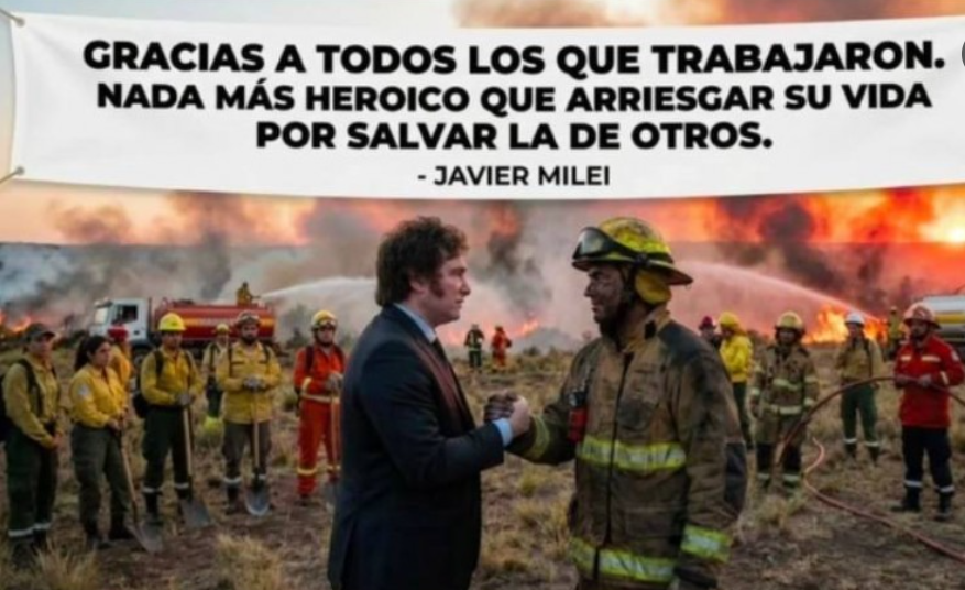 Mientras miles de hectáreas ardían en la Patagonia, la vicepresidenta viajó al Parque Nacional Los Alerces, caminó el terreno y acompañó a brigadistas. Milei, en cambio, no fue. Eligió aparecer en redes con una foto hecha con inteligencia artificial, trajeado, prolijo, saludando bomberos en medio de un incendio digital. Presencia virtual. Gestión real, cero.