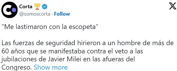 Minutos después de que fracasara el intento opositor de rechazar el veto de Javier Milei a la nueva fórmula jubilatoria, la tensión en las inmediaciones del Congreso escaló de repente. Efectivos de la Policía Federal y la Prefectura salieron rápido a querer dispersar a los manifestantes que, indignados, no van a ceder en su reclamo. La represión alcanzó a la reconocida moviliera de LN+Carla Ricciotti, que estaba cubriendo el minuto a minuto de la escalada y en un momento fue alcanzada por los gases y no pudo contestar a los llamados que desde el piso le hacía su colega Esteban «el pelado» Trebuq. «Chicos, díganme si Carla está bien», reclamaba el conductor.