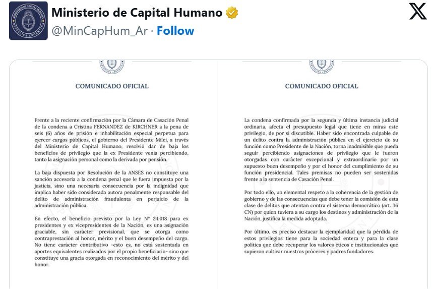 En las redes sociales de la cartera dirigida por Sandra Pettovello, colgaron un comunicado que decía: «La baja dispuesta por Resolución de la ANSES no constituye una sanción accesoria a la condena penal que le fuera impuesta por la justicia, sino una necesaria consecuencia por la indignidad que implica haber sido considerada autora penalmente responsable del delito de administración fraudulenta en perjuicio de la administración pública». Para la Casa Rosada «haber sido encontrada culpable de un delito contra la administración pública en el ejercicio de su función como Presidente, torna inadmisible que pueda seguir percibiendo asignaciones de privilegio que le fueron otorgadas con carácter excepcional y extraordinario por un supuesto buen desempeño y por el honor del cumplimiento de su función».